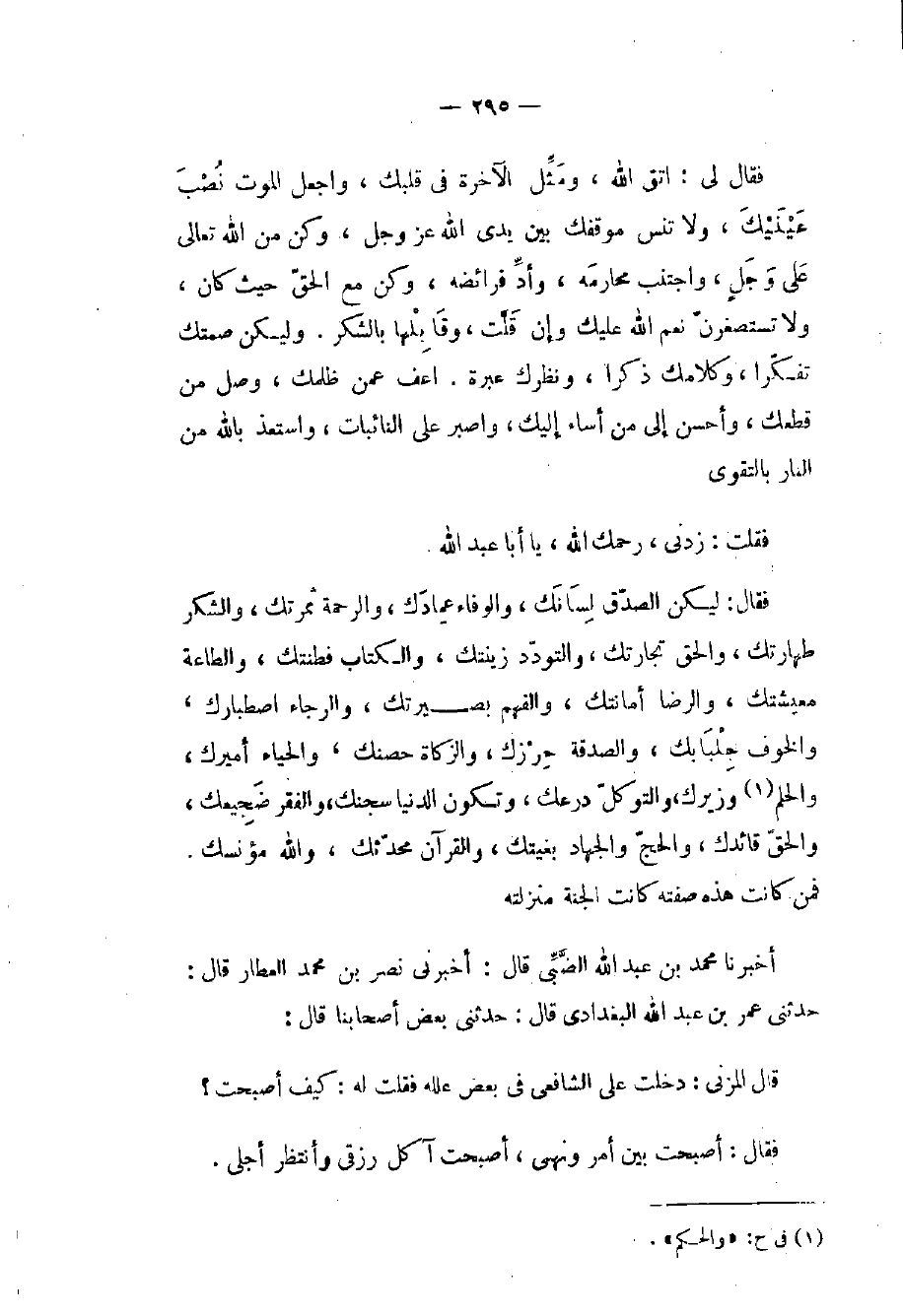فقال لي: اتق الله، ومَثِّل الآخرة في قلبك، واجعل الموت نُصْبَ عَيْنَيْكَ، ولا تنس موقفك بين يدي الله عز وجل، وكن من الله تعالى عَلى وَجَلٍ، واجتنب محارمَه، وأدِّ فرائضه، وكن مع الحقّ حيث كان، ولا تستصغرنّ نعم الله عليك وإن قَلَّت، وقَابِلْها بالشكر. وليكن صمتك تفكّرا، وكلامك ذكرا، ونظرك عبرة. اعف عمن ظلمك، وصل من قطعك، وأحسن إلى من أساء إليك، واصبر على النائبات، واستعذ بالله من النار بالتقوى