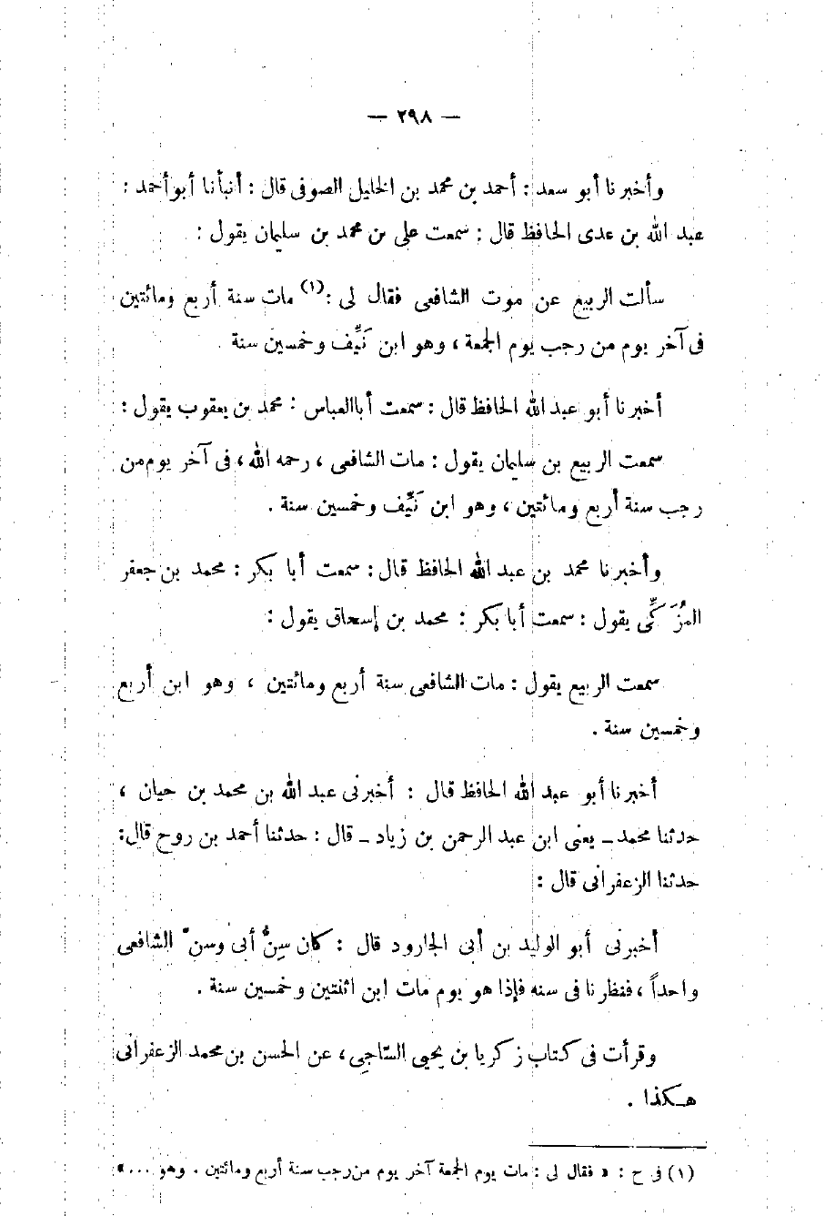سمعت الربيع بن سليمان يقول: مات الشافعي، رحمه الله، في آخر يوم من رجب سنة أربع ومائتين، وهو ابن نَيِّف وخمسين سنة.