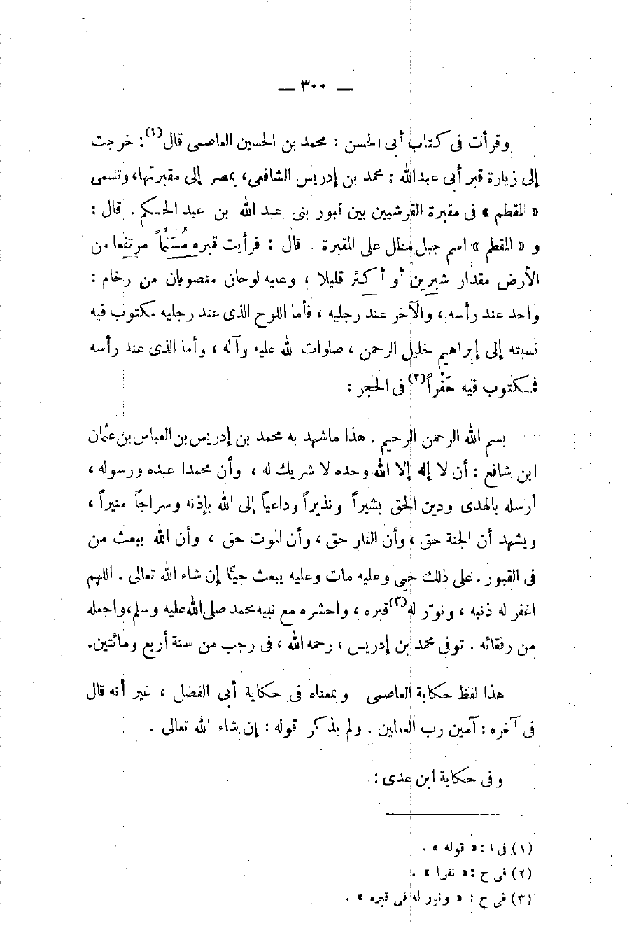 وقرأت في كتاب أبي الحسن: محمد بن الحسين العاصمي قال (١): خرجت إلى زيارة قبر أبي عبد الله: محمد بن إدريس الشافعي، بمصر إلى مقبرتها، وتسمى «المقطم» في مقبرة القرشيين بين قبور بني عبد الله بن عبد الحكم. قال: و «المقطم» اسم جبل مطل على المقبرة. قال: فرأيت قبره مُسَنَّماً مرتفعا من الأرض مقدار شبرين أو أكثر قليلا، وعليه لوحان منصوبان من رخام: واحد عند رأسه، والآخر عند رجليه، فأما اللوح الذي عند رجليه فمكتوب فيه نسبته إلى إبراهيم خليل الرحمن، صلوات الله عليه وآله، وأما الذي عند رأسه فمكتوب فيه حَفْراَ (٢) في الحجر: