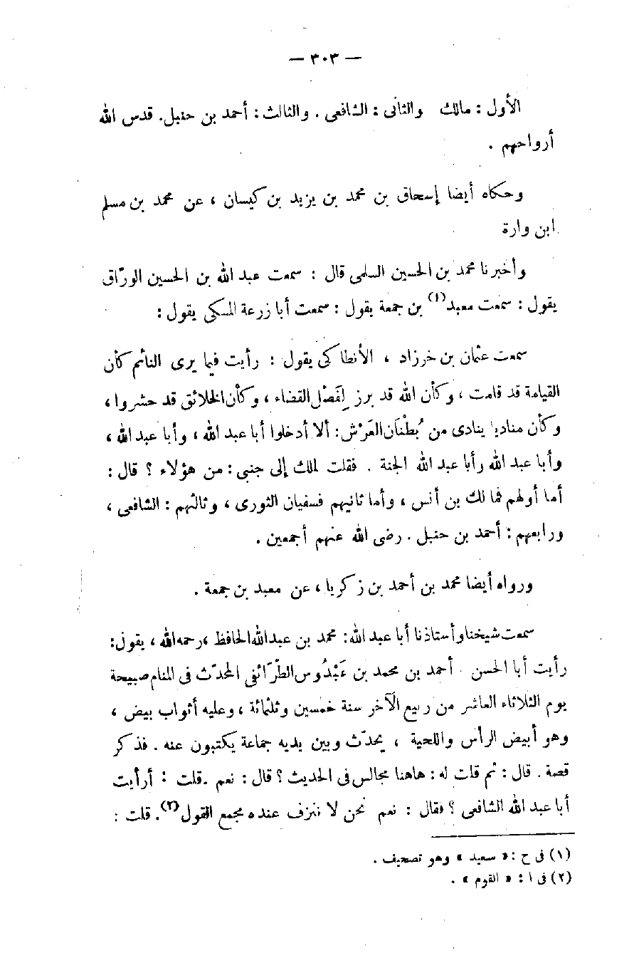 سمعت شيخنا وأستاذنا أبا عبد الله: محمد بن عبد الله الحافظ، رحمه الله، يقول: رأيت أبا الحسن أحمد بن محمد بن عَبْدُوس الطَرَائفي المحدّث في المنام صبيحة يوم الثلاثاء العاشر من ربيع الآخر سنة خمسين وثلثمائة، وعليه أثواب بيض، وهو أبيض الرأس واللحية، يحدّث وبين يديه جماعة يكتبون عنه. فذكر قصة. قال: ثم قلت له: هاهنا مجالس في الحديث؟ قال: نعم. قلت: أرأيت أبا عبد الله الشافعي؟ فقال: نعم نحن لا ننزف عنده مجمع القول (٢). قلت: