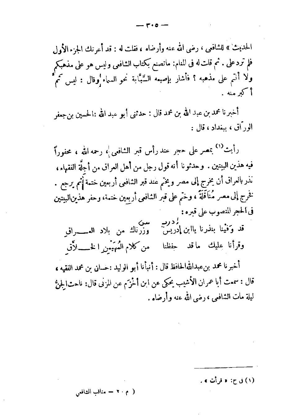 رأيت (١) بمصر على حجر عند رأس قبر الشافعي، رحمه الله، محفوراً فيه هذين البيتين. وحدثونا أنه قول رجل من أهل العراق من أجِلَّة الفقهاء، نذر بالعراق أن يخرج إلى مصر ويختم عند قبر الشافعي أربعين ختمة ثم يرجع. فخرج إلى مصر مُنَاقَلَةً، وختم على قبر الشافعي أربعين ختمة، وحفر هذين البيتين في الحجر المنصوب على قبره: