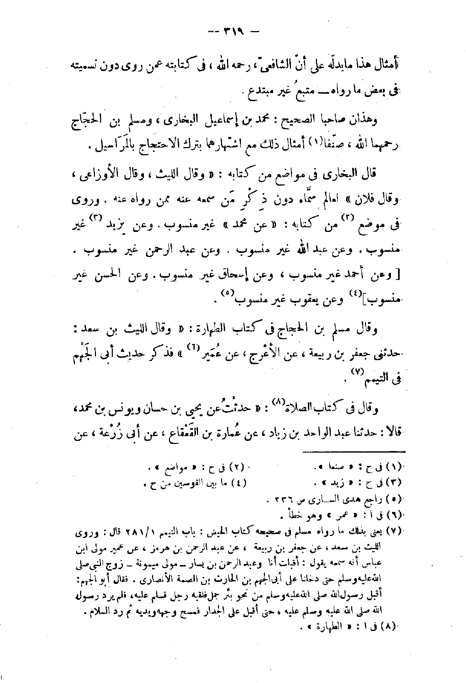 (٧) يعني بذلك ما رواه مسلم في صحيحه كتاب الحيض: باب التيمم ١/ ٢٨١ قال: وروى الليث بن سعد، عن جعفر بن ربيعة، عن عبد الرحمن بن هرمز، عن عمير مولى ابن عباس أنه سمعه يقول: أقبلت أنا وعبد الرحمن بن يسار - مولى ميمونة - زوج النبي صلى الله عليه وسلم حتى دخلنا على أبي الجهم بن الحارث بن الصمة الأنصاري. فقال أبو الجهم: أقبل رسول الله صلى الله عليه وسلم من نحو بئر جمل فلقيه رجل فسلم عليه، فلم يرد رسول الله صلى الله عليه وسلم عليه، حتى أقبل على الجدار فمسح يديه ثم رد السلام.