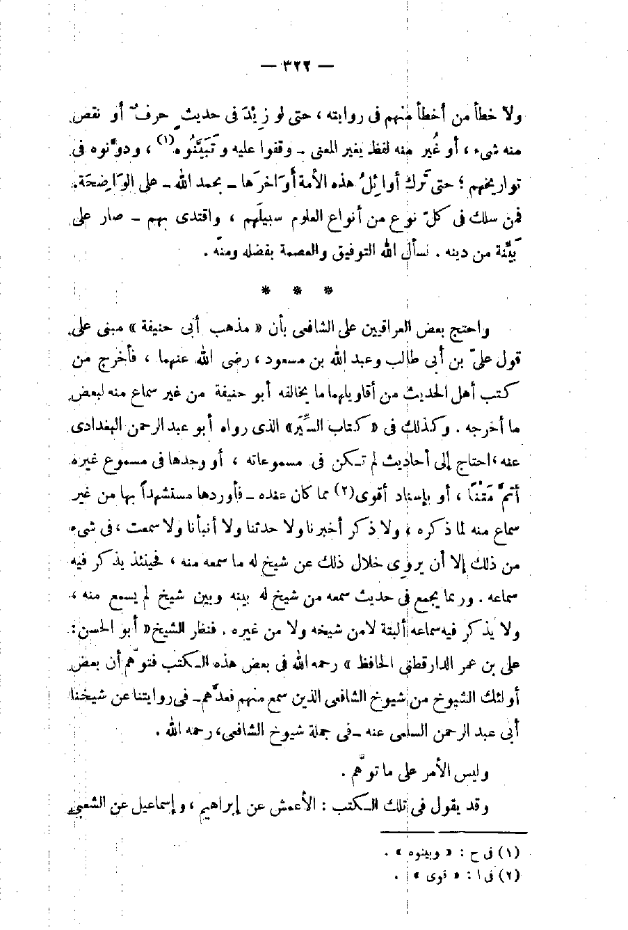 واحتج بعض العراقيين على الشافعي بأن «مذهب أبي حنيفة» مبني على قول عليّ بن أبي طالب وعبد الله بن مسعود، رضي الله عنهما، فأخرج من كتب أهل الحديث من أقاويلهما ما يخالفه أبو حنيفة من غير سماع منه لبعض ما أخرجه. وكذلك في «كتاب السِّيَر» الذي رواه أبو عبد الرحمن البغدادي عنه، احتاج إلى أحاديث لم تكن في مسموعاته، أو وجدها في مسموع غيره أتمَّ مَتْنًا، أو بإسناد أقوى (٢) مما كان عنده - فأوردها مستشهداً بها من غير سماع منه لما ذكره، ولا ذكر أخبرنا ولا حدثنا ولا أنبأنا ولا سمعت، في شيء من ذلك إلا أن يروِي خلال ذلك عن شيخ له ما سمعه منه، فحينئذ يذكر فيه سماعه. وربما يجمع في حديث سمعه من شيخ له بينه وبين شيخ لم يسمع منه، ولا يذكر فيه سماعه ألبتة لا من شيخه ولا من غيره. فنظر الشيخ «أبو الحسن: علي بن عمر الدارقطني الحافظ» رحمه الله في بعض هذه الكتب فتوهّم أن بعض أولئك الشيوخ من شيوخ الشافعي الذين سمع منهم فعدَّهم - في روايتنا عن شيخنا أبي عبد الرحمن السلمي عنه - في جملة شيوخ الشافعي، رحمه الله.