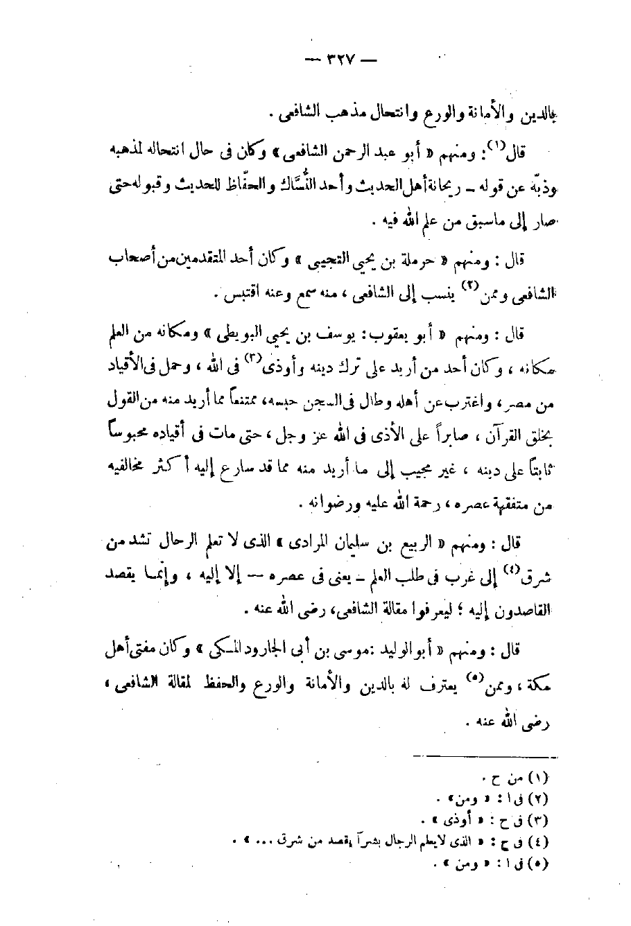 قال: ومنهم «الربيع بن سليمان المرادي» الذي لا تعلم الرحال تشد من شرق (٤) إلى غرب في طلب العلم - يعني في عصره - إلا إليه، وإنما يقصد القاصدون إليه؛ ليعرفوا مقالة الشافعي، رضي الله عنه.