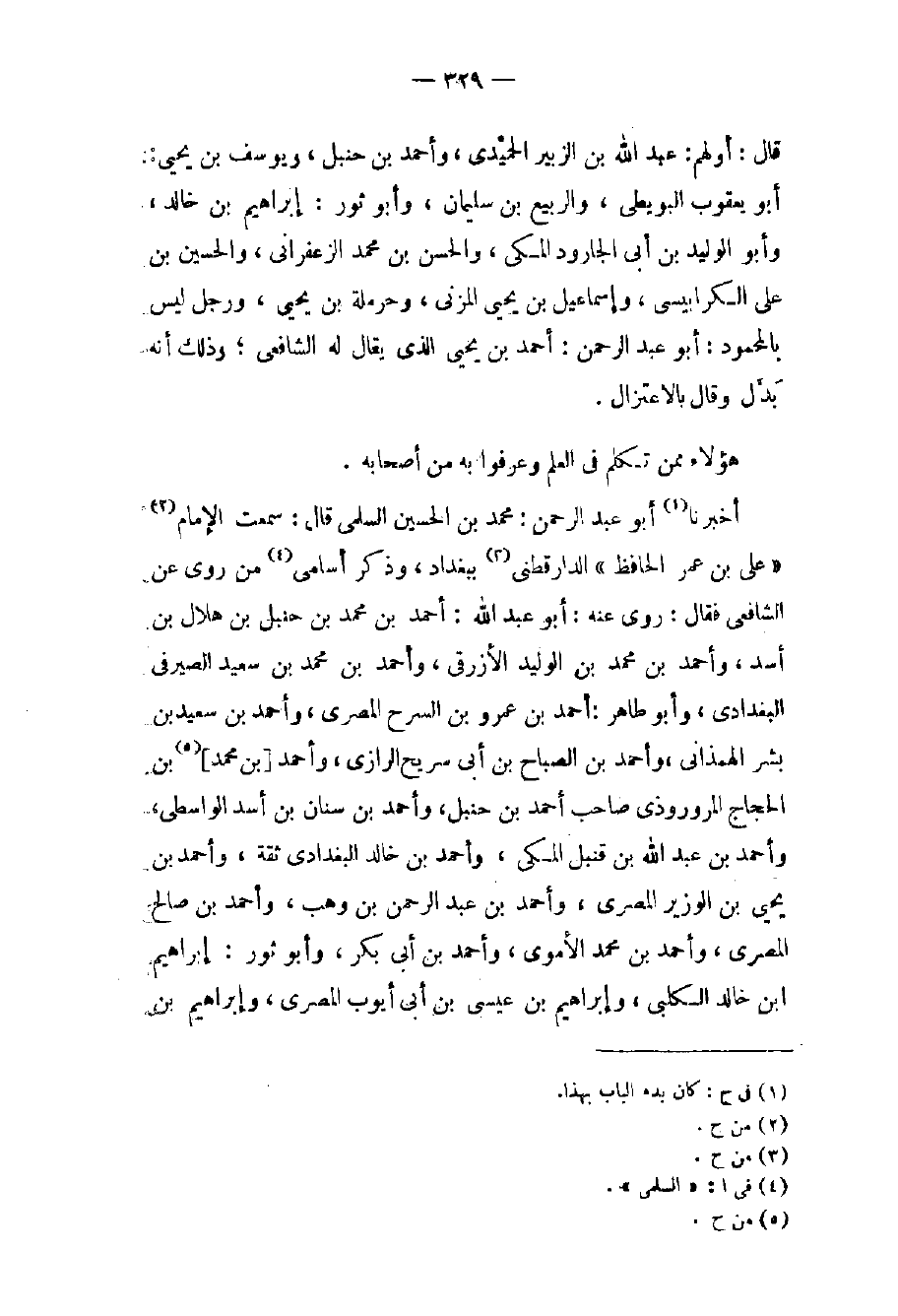 أخبرنا (١) أبو عبد الرحمن: محمد بن الحسين السلمي قال: سمعت الإمام (٢) «علي بن عمر الحافظ» الدارقطني (٣) ببغداد، وذكر أسامي (٤) من روى عن الشافعي فقال: روى عنه: أبو عبد الله: أحمد بن محمد بن حنبل بن هلال بن أسد، وأحمد بن محمد بن الوليد الأزرقي، وأحمد بن محمد بن سعيد الصيرفي البغدادي، وأبو طاهر: أحمد بن عمرو بن السرح المصري، وأحمد بن سعيد بن بشر الهمذاني، وأحمد بن الصباح بن أبي سريج الرازي، وأحمد [بن محمد] (٥) بن الحجاج المروروذي صاحب أحمد بن حنبل، وأحمد بن سنان بن أسد الواسطي، وأحمد بن عبد الله بن قنبل المكي، وأحمد بن خالد البغدادي ثقة، وأحمد بن يحيى بن الوزير المصري، وأحمد بن عبد الرحمن بن وهب، وأحمد بن صالح المصري، وأحمد بن محمد الأموي، وأحمد بن أبي بكر، وأبو ثور: إبراهيم بن خالد الكلبي، وإبراهيم بن عيسى بن أبي أيوب المصري، وإبراهيم بن