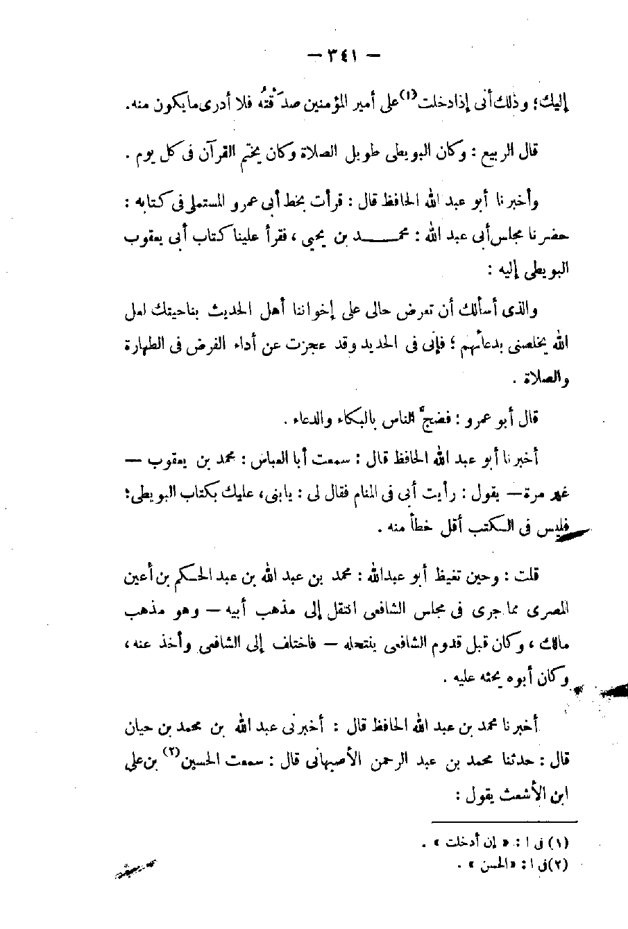 وأخبرنا أبو عبد الله الحافظ قال: قرأت بخط أبي عمرو المستملي في كتابه: حضرنا مجلس أبي عبد الله: محمد بن يحيى، فقرأ علينا كتاب أبي يعقوب البويطي إليه: