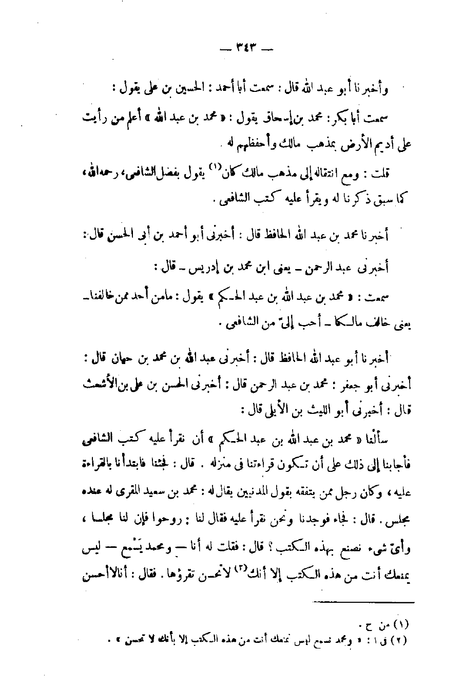 سألْنا «محمد بن عبد الله بن عبد الحكم» أن نقرأ عليه كتب الشافعي فأجابنا إلى ذلك على أن تكون قراءتنا في منزله. قال: فجئنا فابتدأنا بالقراءة عليه، وكان رجل ممن يتفقه بقول المدنيين يقال له: محمد بن سعيد المقري له عنده مجلس. قال: فجاء فوجدنا ونحن نقرأ عليه فقال لنا: روحوا فإن لنا مجلسا، وأيّ شيء نصنع بهذه الكتب؟ قال: فقلت له أنا - ومحمد يَسْمع - ليس يمنعك أنت من هذه الكتب إلا أنك (٢) لا تحسن تقرؤها. فقال: أنا لا أحسن