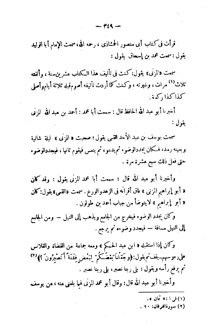 وأخبرنا أبو عبد الله قال: سمعت أبا محمد المزني يقول: وقد كان «أبو إبراهيم المزني» فاق أقرانه في الزهد والورع. سمعت «القمي» يقول: كان «أبو إبراهيم» لا يتوضأ من جباب أحمد بن طولون.