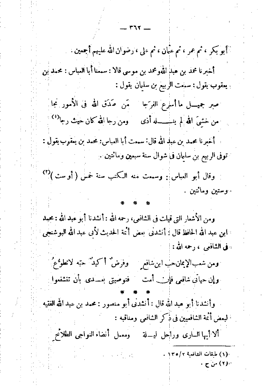 ومن الأشعار التي قيلت في الشافعي، رحمه الله: أنشدنا أبو عبد الله: محمد ابن عبد الله الحافظ قال: أنشدني بعض أئمة الحديث لأبي عبد الله البوشنجي في الشافعي، رحمه الله:
