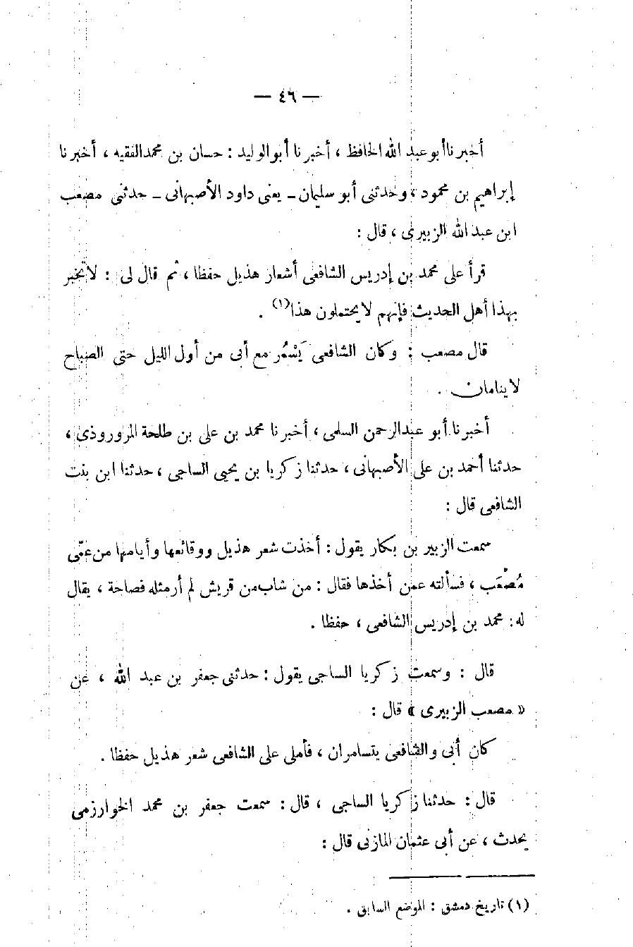 أخبرنا أبو عبد الرحمن السلمي، أخبرنا محمد بن علي بن طلحة المروروذي، حدثنا أحمد بن على الأصبهاني، حدثنا زكريا بن يحيى الساجي، حدثنا ابن بنت الشافعي قال: