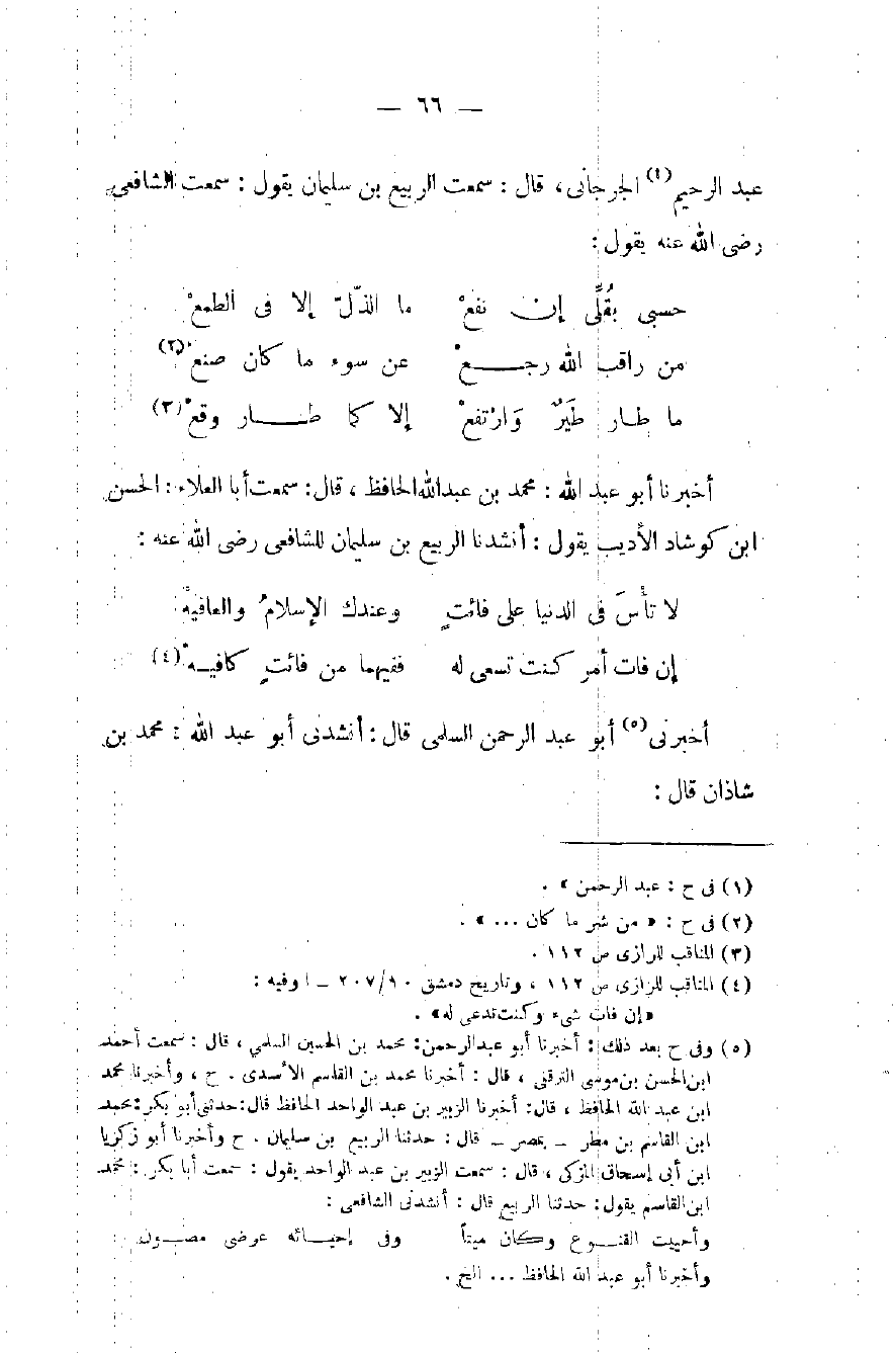 (٥) وفي ح بعد ذلك: أخبرنا أبو عبد الرحمن: محمد بن الحسين السلمي، قال: سمعت أحمد ابن الحسن موسى الترقفي، قال: أخبرنا محمد بن القاسم الأسدي. ح، وأخبرنا محمد ابن عبد الله الحافظ، قال: أخبرنا الزبير بن عبد الواحد الحافظ قال: حدثني أبو بكر: محمد ابن القاسم بن مطر - بمصر - قال: حدثنا الربيع بن سليمان. ح وأخبرنا أبو زكريا ابن أبي إسحاق المزكي، قال: سمعت الزبير بن عبد الواحد يقول: سمعت أبا بكر: محمد ابن القاسم يقول: حدثنا الربيع قال: أنشدني الشافعي:
