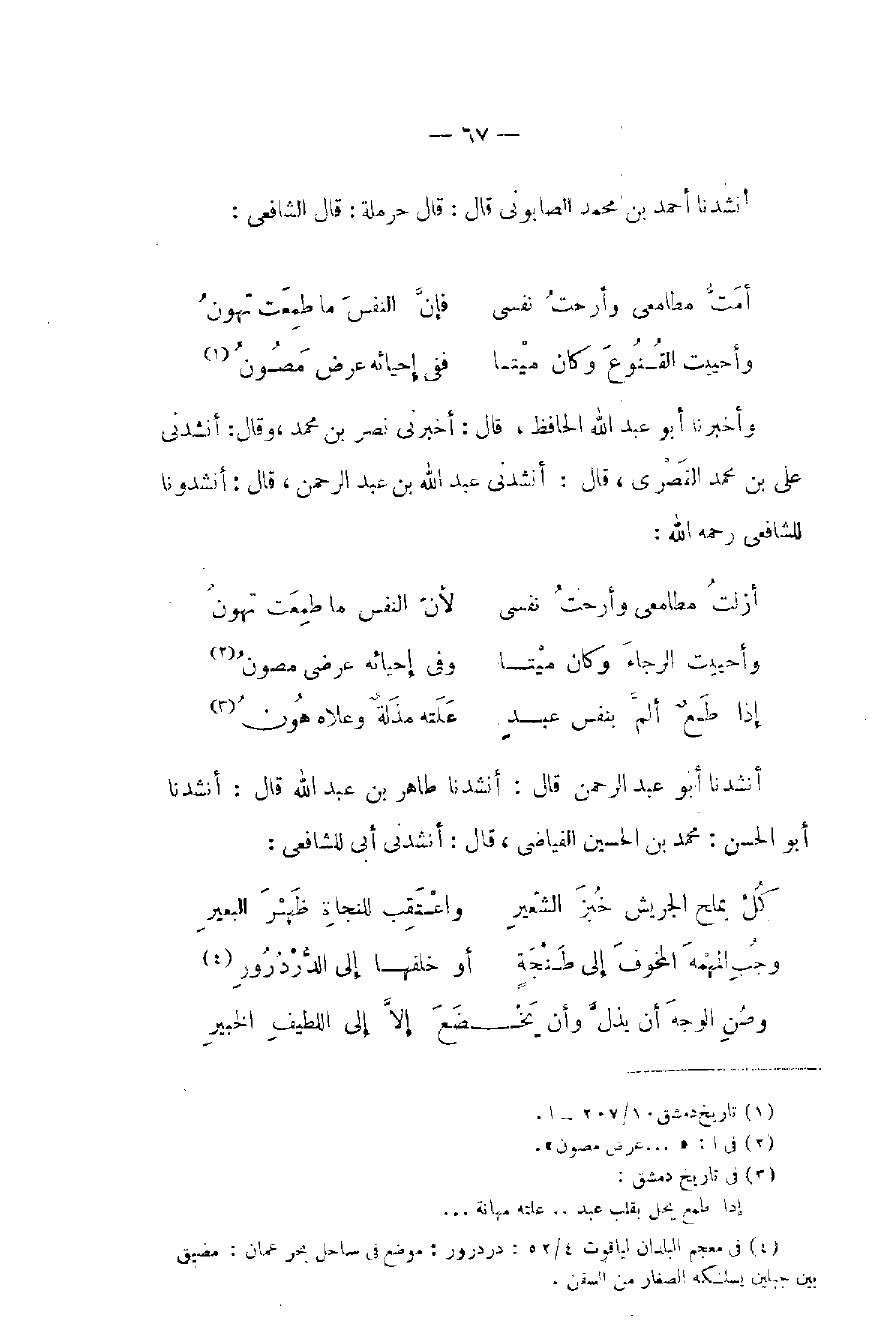 أنشدنا أبو عبد الرحمن قال: أنشدنا طاهر بن عبد الله قال: أنشدنا أبو الحسن: محمد بن الحسين الفياضي، قال: أنشدني أبي للشافعي: