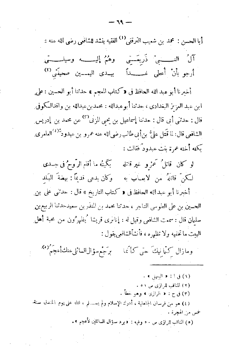 أبا الحسن: محمد بن شعيب الترقفي (١) الفقيه ينشد للشافعي رضي الله عنه: