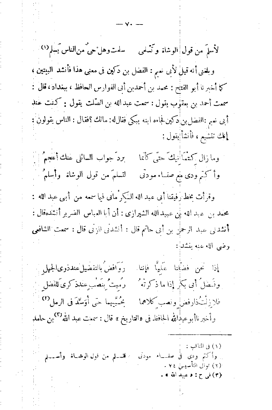 وبلغني أنه قيل لأبي نعيم: الفضل بن دكين في معنى هذا فأنشد البيتين، كما أخبرنا أبو الفتح: محمد بن أحمد بن أبي الفوارس الحافظ، ببغداد، قال: سمعت أحمد بن يعقوب يقول: سمعت عبد الله بن الصّلت يقول: كنت عند أبي نعيم: الفضل بن دكين فجاءه ابنه يبكي فقال له: مالك؟ فقال: الناس يقولون: إنك تتشيع، فأنشأ يقول: