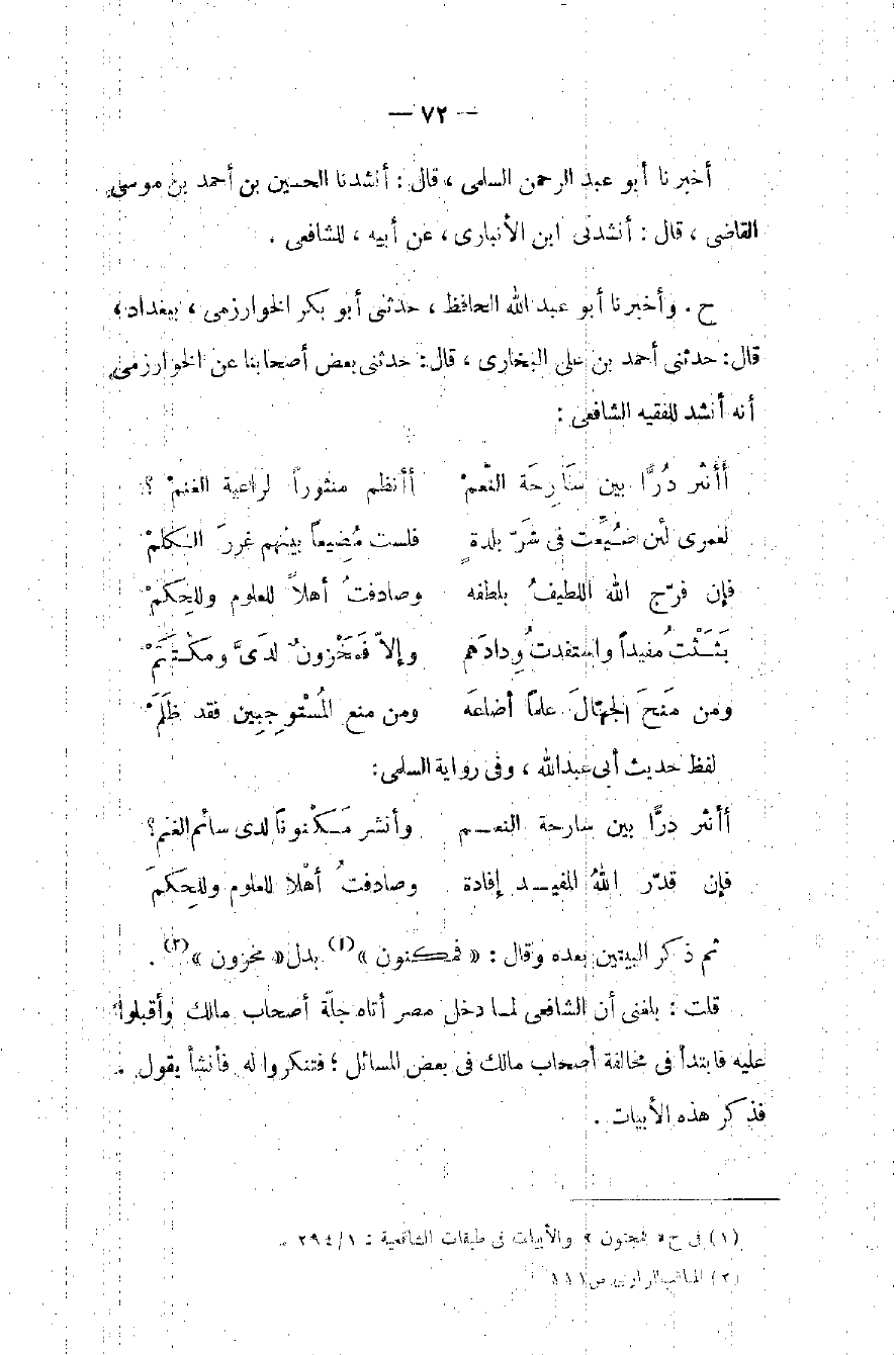 ح. وأخبرنا أبو عبد الله الحافظ، حدثني أبو بكر الخوارزمي، ببغداد، قال: حدثني أحمد بن علي البخاري، قال: حدثني بعض أصحابنا عن الخوارزمي لأنه أنشد للفقيه الشافعي: