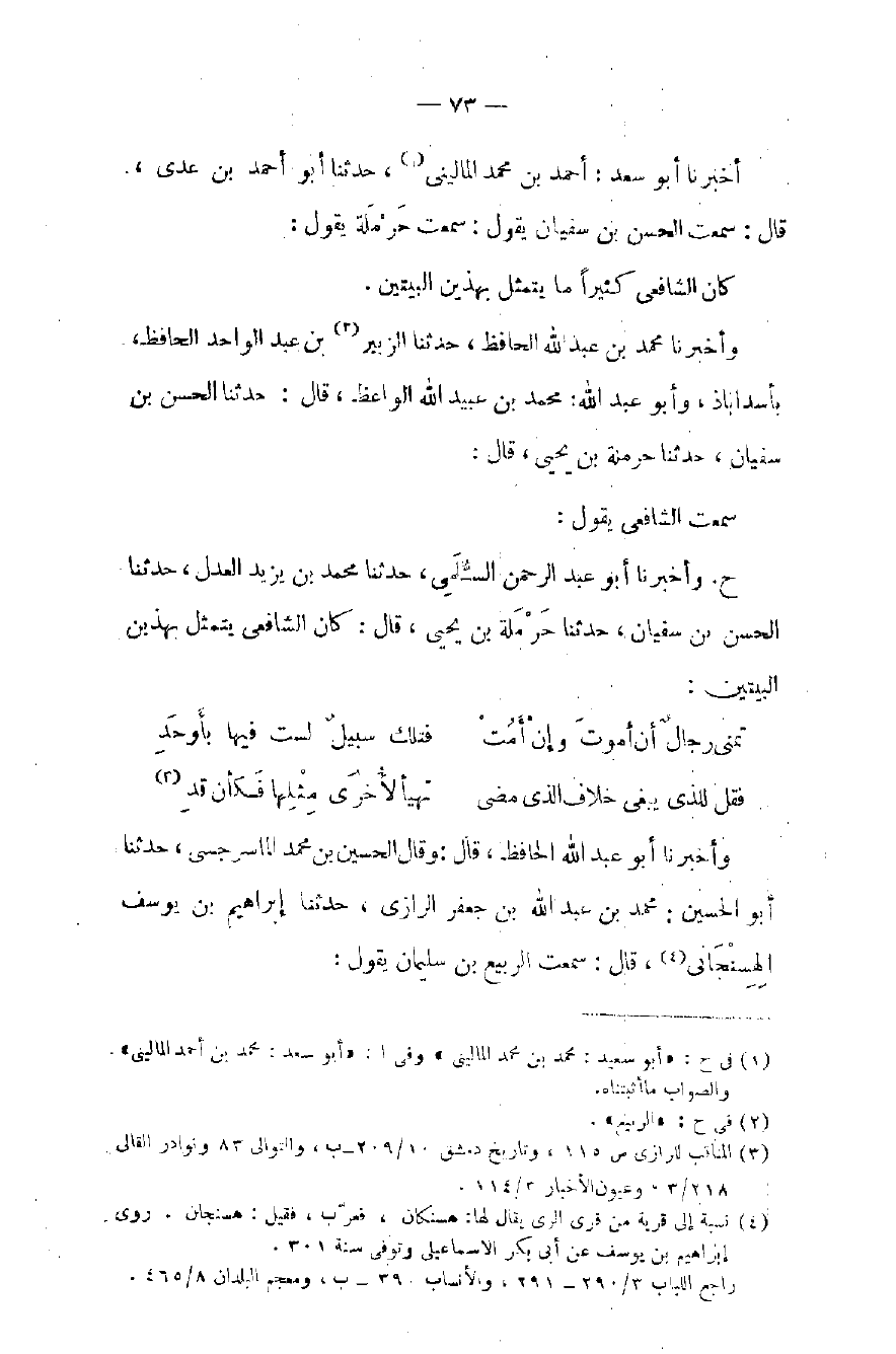 ح. وأخبرنا أبو عبد الرحمن السُّلَمِي، حدثنا محمد بن يزيد العدل، حدثنا الحسن بن سفيان، حدثنا حَرْمَلة بن يحيى، قال: كان الشافعي يتمثل بهذين البيتين: