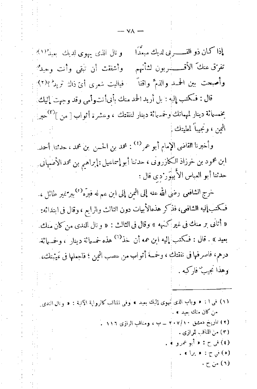 خرج الشافعي رضي الله عنه إلى اليمن إلى ابن عم له فبرّه (٥) ببرّ غير طائل، فكتب إليه الشافعي، فذكر هذه الأبيات دون الثالث والرابع، وقال في ابتدائه: «أتاني بر منك في غير كنهه» وقال في الثالث: «ونال الندى من كان منك بعيد». قال: فكتب إليه ابن عمه أن خذ (٦) هذه خمسمائة دينار، وخمسمائة درهم، فاصرفها في نفقتك، وخمسة أثواب من عصب اليمن؛ فاجعلها في عَيْبتك، وهذا نجيبٌ فاركبه.