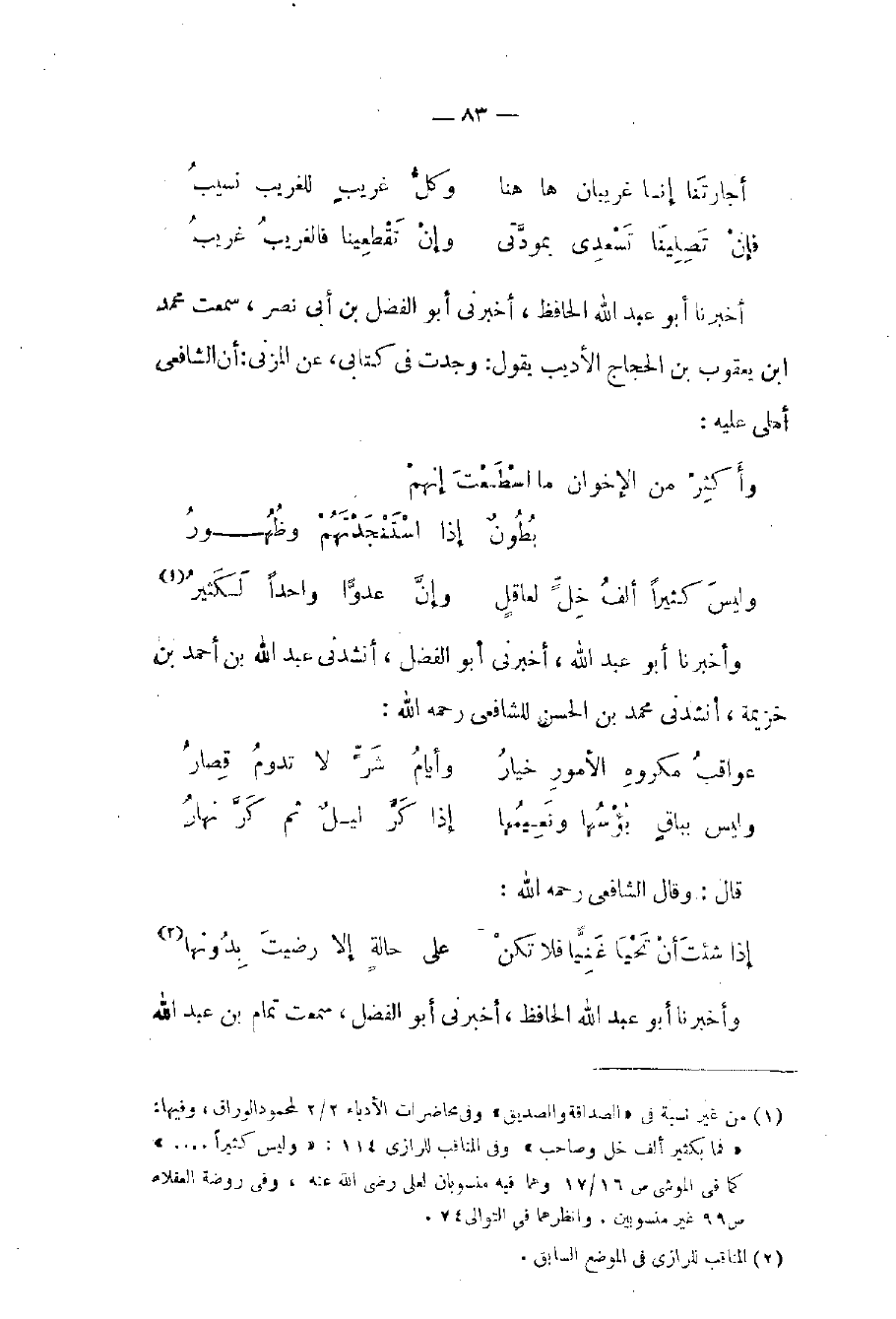 وأخبرنا أبو عبد الله، أخبرني أبو الفضل، أنشدني عبد الله بن أحمد بن خزيمة، أنشدني محمد بن الحسن للشافعي رحمه الله: