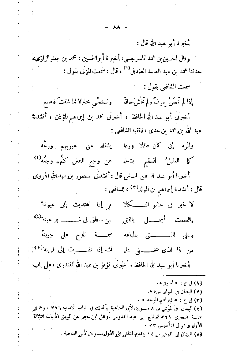 (٤) البيتان في الموشي ص ٨ منسوبين لأبي العتاهية وكذلك في لباب الآداب ٢٧٦، وهما في حماسة البحتري ٢٢٩ لصالح عبد القدوس. ونقل ابن حجر عن البيهقي الأبيات الثلاثة الأول في توالي التأسيس ٧٣.