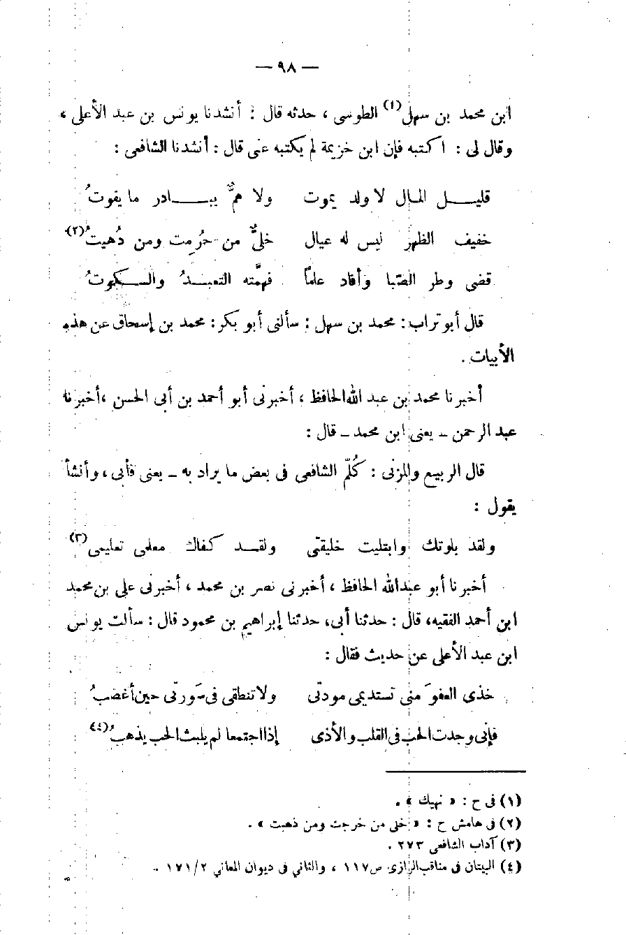 ابن محمد بن سهل (١) الطوسي، حدثه قال: أنشدنا يونس بن عبد الأعلى، وقال لي: اكتبه فإن ابن خزيمة لم يكتبه عني قال: أنشدنا الشافعي: