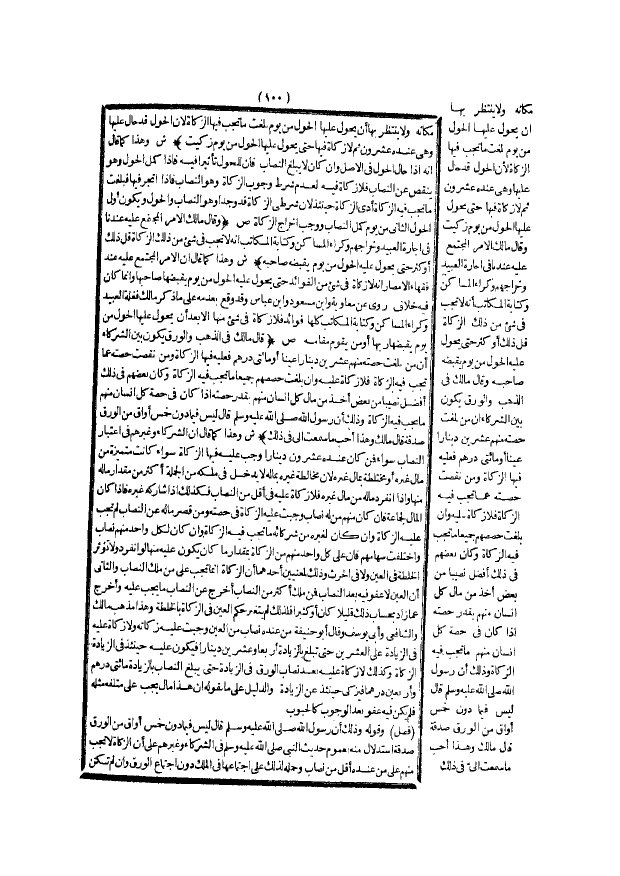 (ش) : وَهَذَا كَمَا قَالَ إنَّ الشُّرَكَاءَ وَغَيْرَهُمْ فِي اعْتِبَارِ النِّصَابِ سَوَاءٌ فَمَنْ كَانَ عِنْدَهُ عِشْرُونَ دِينَارًا وَجَبَ عَلَيْهِ فِيهَا الزَّكَاةُ سَوَاءٌ كَانَتْ مُتَمَيِّزَةً مِنْ مَالِ غَيْرِهِ أَوْ مُخْتَلِطَةً بِمَالِ غَيْرِهِ؛ لِأَنَّ مُخَالَطَةَ غَيْرِهِ بِمَالِهِ لَا يُدْخِلُ فِي مِلْكِهِ مِنْ الْجُمْلَةِ أَكْثَرَ مِنْ مِقْدَارِ مَالِهِ مِنْهَا، وَإِذَا انْفَرَدَ مَالُهُ مِنْ مَالِ غَيْرِهِ فَلَا زَكَاةَ عَلَيْهِ فِي أَقَلَّ مِنْ النِّصَابِ فَكَذَلِكَ إذَا شَارَكَهُ غَيْرُهُ فَإِذَا كَانَ الْمَالُ لِجَمَاعَةٍ فَإِنْ كَانَ مِنْهُمْ مَنْ لَهُ نِصَابٌ وَجَبَتْ عَلَيْهِ الزَّكَاةُ فِي حِصَّتِهِ وَمَنْ قَصُرَ مَالُهُ عَنْ النِّصَابِ لَمْ تَجِبْ عَلَيْهِ الزَّكَاةُ، وَإِنْ كَانَ لِغَيْرِهِ مِنْ شُرَكَائِهِ مَا تَجِبُ فِيهِ الزَّكَاةُ، وَإِنْ كَانَ لِكُلِّ وَاحِدٍ مِنْهُمْ نِصَابٌ وَاخْتَلَفَتْ سِهَامُهُمْ فَإِنَّ عَلَى كُلِّ وَاحِدٍ مِنْهُمْ مِنْ الزَّكَاةِ بِمِقْدَارِ مَا كَانَ يَكُونُ عَلَيْهِ مِنْهَا لَوْ انْفَرَدَ وَلَا تُؤَثِّرُ الْخُلْطَةُ فِي الْعَيْنِ وَلَا فِي الْحَرْثِ وَذَلِكَ لِمَعْنَيَيْنِ: