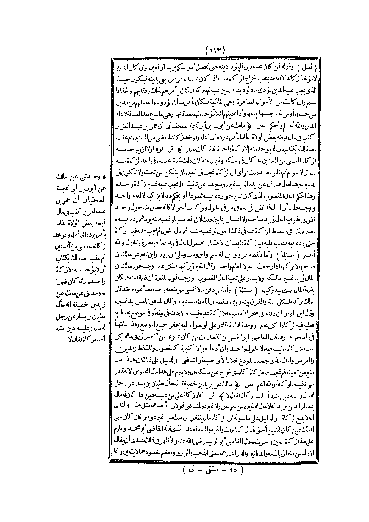(ص) : (مَالِكٌ عَنْ يَزِيدَ بْنِ خُصَيْفَةَ أَنَّهُ سَأَلَ سُلَيْمَانَ بْنَ يَسَارٍ عَنْ رَجُلٍ لَهُ مَالٌ وَعَلَيْهِ دَيْنٌ مِثْلُهُ أَعَلَيْهِ زَكَاةٌ فَقَالَ لَا) .