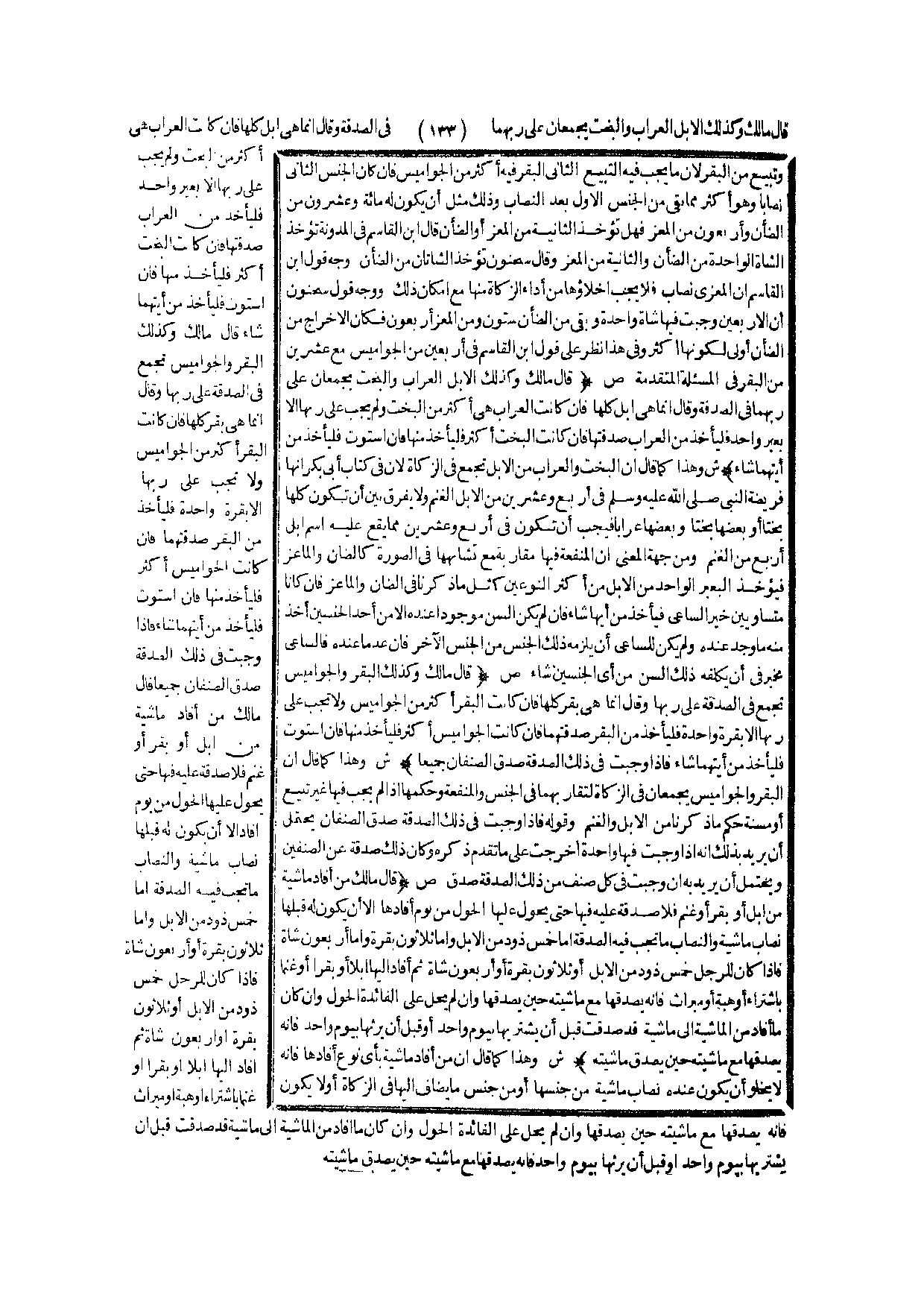 (ش) : وَهَذَا كَمَا قَالَ إنَّ الْبَقَرَ وَالْجَوَامِيسَ يُجْمَعَانِ فِي الزَّكَاةِ لِتَقَارُبِهِمَا فِي الْجِنْسِ وَالْمَنْفَعَةِ وَحُكْمُهَا إذَا لَمْ يَجِبْ فِيهَا غَيْرُ تَبِيعٍ أَوْ مُسِنَّةٍ حُكْمُ مَا ذَكَرْنَا مِنْ الْإِبِلِ وَالْغَنَمِ وَقَوْلُهُ فَإِذَا وَجَبَتْ فِي ذَلِكَ الصَّدَقَةُ صُدِّقَ الصِّنْفَانِ يُحْتَمَلُ أَنْ يُرِيدَ بِذَلِكَ أَنَّهُ إذَا وَجَبَتْ فِيهَا وَاحِدَةٌ أُخْرِجَتْ عَلَى مَا تَقَدَّمَ ذِكْرُهُ وَكَانَ ذَلِكَ صَدَقَةً عَنْ الصِّنْفَيْنِ وَيُحْتَمَلُ أَنْ يُرِيدَ بِهِ إنْ وَجَبَتْ فِي كُلِّ صِنْفٍ مِنْ ذَلِكَ الصَّدَقَةُ صُدِّقَ.
