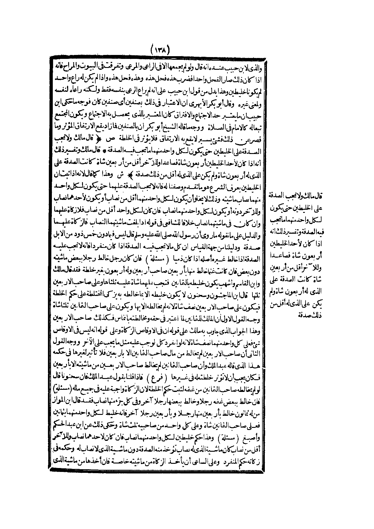 ـــــــــــــــــــــــــــــQوَاَلَّذِي لِابْنِ حَبِيبٍ عِنْدَهُ أَنَّهُ قَالَ وَلَوْ لَمْ يَجْمَعْهَا إلَّا فِي الرَّاعِي وَالْمَرْعَى وَتَفَرَّقَتْ فِي الْبُيُوتِ وَالْمُرَاحِ فَإِنَّهُ إذَا كَانَ ذَلِكَ صَارَ الْفَحْلُ وَاحِدًا فَضَرَبَ هَذِهِ فَحْلَ هَذِهِ وَهَذِهِ فَحْلَ هَذِهِ، وَإِذَا لَمْ يَكُنْ لَهُ رَاعٍ وَاحِدٌ لَمْ يَكُونَا خَلِيطَيْنِ وَهَذَا يَدُلُّ مِنْ قَوْلِ ابْنِ حَبِيبٍ عَلَى أَنَّهُ لَمْ يُرَاعِ الرَّعْيَ بِنَفْسِهِ فَقَطْ وَلَكِنَّهُ رَاعَاهُ لِنَفْسِهِ وَلِمَعْنَى غَيْرِهِ.