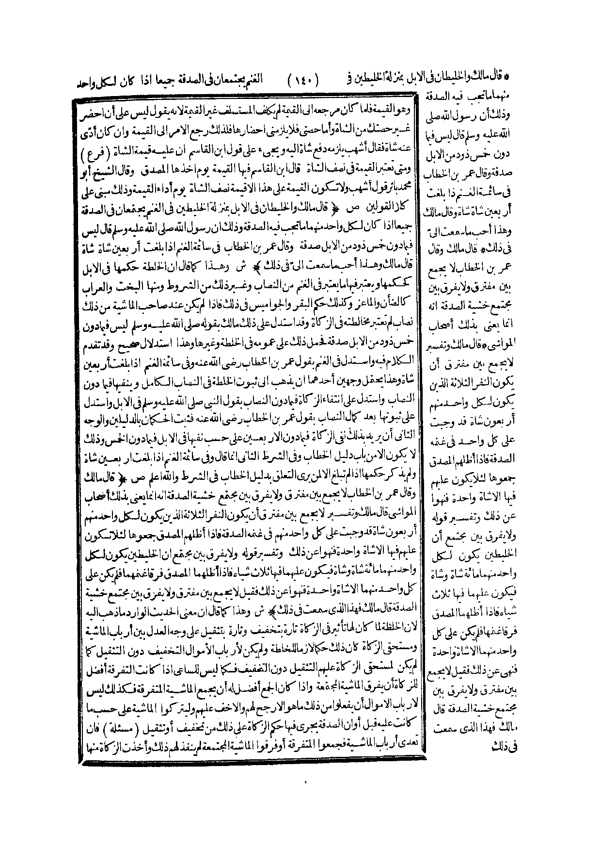 (ص) : (قَالَ مَالِكٌ، وَقَالَ عُمَرُ بْنُ الْخَطَّابِ لَا يُجْمَعُ بَيْنَ مُفْتَرِقٍ وَلَا يُفَرَّقُ بَيْنَ مُجْتَمِعٍ خَشْيَةَ الصَّدَقَةِ أَنَّهُ إنَّمَا يَعْنِي بِذَلِكَ أَصْحَابَ الْمَوَاشِي قَالَ مَالِكٌ وَتَفْسِيرُ لَا يُجْمَعُ بَيْنَ مُفْتَرِقٍ أَنْ يَكُونَ النَّفَرُ الثَّلَاثَةُ الَّذِينَ يَكُونُ لِكُلِّ وَاحِدٍ مِنْهُمْ أَرْبَعُونَ شَاةً قَدْ وَجَبَتْ عَلَى كُلِّ وَاحِدٍ مِنْهُمْ فِي غَنَمِهِ الصَّدَقَةُ فَإِذَا أَظَلَّهُمْ الْمُصَّدِّقُ جَمَعُوهَا لِئَلَّا تَكُونَ عَلَيْهِمْ فِيهَا إلَّا شَاةٌ وَاحِدَةٌ فَنُهُوا عَنْ ذَلِكَ وَتَفْسِيرُ قَوْلِهِ وَلَا يُفَرَّقُ بَيْنَ مُجْتَمِعٍ أَنَّ الْخَلِيطَيْنِ يَكُونُ لِكُلِّ وَاحِدٍ مِنْهُمَا مِائَةُ شَاةٍ وَشَاةٌ فَيَكُونُ عَلَيْهِمَا فِيهَا ثَلَاثُ شِيَاهٍ فَإِذَا أَظَلَّهُمَا الْمُصَّدِّقُ فَرَّقَا غَنَمَهُمَا فَلَمْ يَكُنْ عَلَى كُلِّ وَاحِدٍ مِنْهُمَا إلَّا شَاةٌ وَاحِدَةٌ فَنُهُوا عَنْ ذَلِكَ فَقِيلَ لَا يُجْمَعُ بَيْنَ مُفْتَرِقٍ وَلَا يُفَرَّقُ بَيْنَ مُجْتَمِعٍ خَشْيَةَ الصَّدَقَةِ قَالَ مَالِكٌ فَهَذَا الَّذِي سَمِعْت فِي ذَلِكَ)
