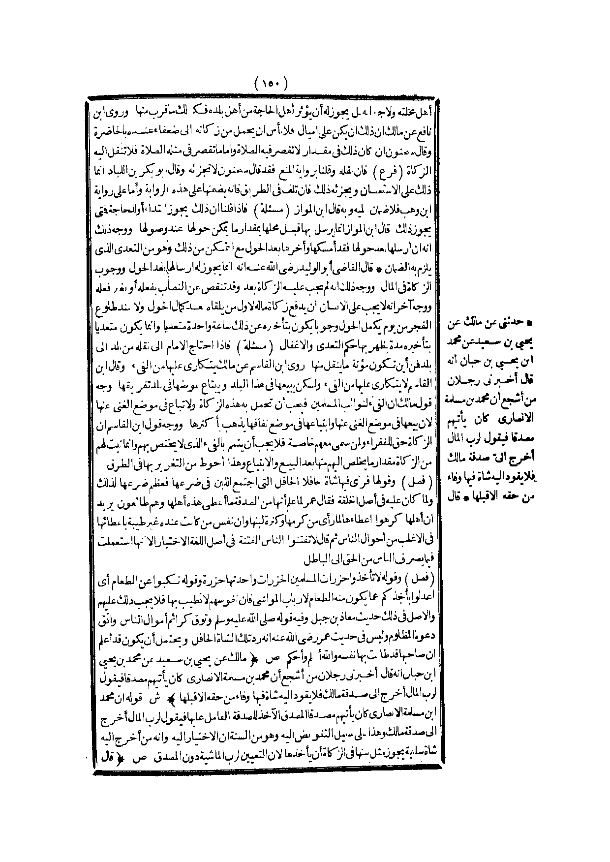 (فَصْلٌ وَقَوْلُهُ لَا تَأْخُذُوا حَزَرَاتِ الْمُسْلِمِينَ الْحَزَرَاتُ وَاحِدَتُهَا حَزْرَةٌ وَقَوْلُهُ نَكِّبُوا عَنْ الطَّعَامِ أَيْ اعْدِلُوا بِأَخْذِكُمْ عَمَّا يَكُونُ مِنْهُ الطَّعَامُ لِأَرْبَابِ الْمَوَاشِي فَإِنَّ نُفُوسَهُمْ لَا تَطِيبُ بِهَا فَلَا يَجِبُ ذَلِكَ عَلَيْهِمْ وَالْأَصْلُ فِي ذَلِكَ حَدِيثُ مُعَاذِ بْنِ جَبَلٍ وَفِيهِ قَوْلُهُ - صَلَّى اللَّهُ عَلَيْهِ وَسَلَّمَ - «وَتَوَقَّ كَرَائِمَ أَمْوَالِ النَّاسِ وَاتَّقِ دَعْوَةَ الْمَظْلُومِ» وَلَيْسَ فِي حَدِيثِ عُمَرَ - رَضِيَ اللَّهُ عَنْهُ - أَنَّهُ رَدَّ تِلْكَ الشَّاةَ الْحَافِلَ وَيُحْتَمَلُ أَنْ يَكُونَ قَدْ أُعْلِمَ أَنَّ صَاحِبَهَا قَدْ طَابَتْ بِهَا نَفْسُهُ، وَاَللَّهُ أَعْلَمُ وَأَحْكَمُ) .