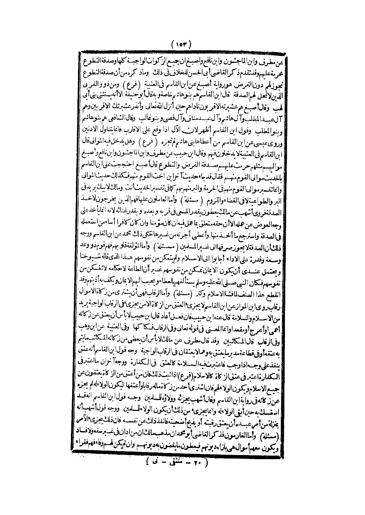(فَرْعٌ) وَهَلْ يَدْخُلُ فِيهِ الْمَوَالِي قَالَ ابْنُ الْقَاسِمِ فِي الْعُتْبِيَّةِ لَا يَدْخُلُونَ فِيهِمْ، وَقَالَ ابْنُ حَبِيبٍ عَنْ مُطَّرِفٍ وَابْنِ الْمَاجِشُونِ وَابْنِ نَافِعٍ وَأَصْبَغَ مَوَالِيهمْ مِثْلُهُمْ حَرُمَتْ عَلَيْهِمْ صَدَقَةُ الْفَرْضِ وَالتَّطَوُّعِ قَالَ أَصْبَغُ احْتَجَجْت عَلَى ابْنِ الْقَاسِمِ بِالْحَدِيثِ مَوَالِي الْقَوْمِ مِنْهُمْ فَقَالَ قَدْ جَاءَ حَدِيثٌ آخَرُ «ابْنُ أُخْتِ الْقَوْمِ مِنْهُمْ» فَكَذَلِكَ حَدِيثُ الْمَوَالِي، وَإِنَّمَا تَفْسِيرُ مَوَالِي الْقَوْمِ مِنْهُمْ فِي الْحُرْمَةِ وَالْبِرِّ مِنْهُمْ بِهِمْ كَمَا فِي تَفْسِيرِ الْحَدِيثِ «أَنْتَ وَمَالُك لِأَبِيك» يُرِيدُ فِي الْبَرِّ وَالطَّوَاعِيَةِ لَا فِي الْقَضَاءِ وَاللُّزُومِ.