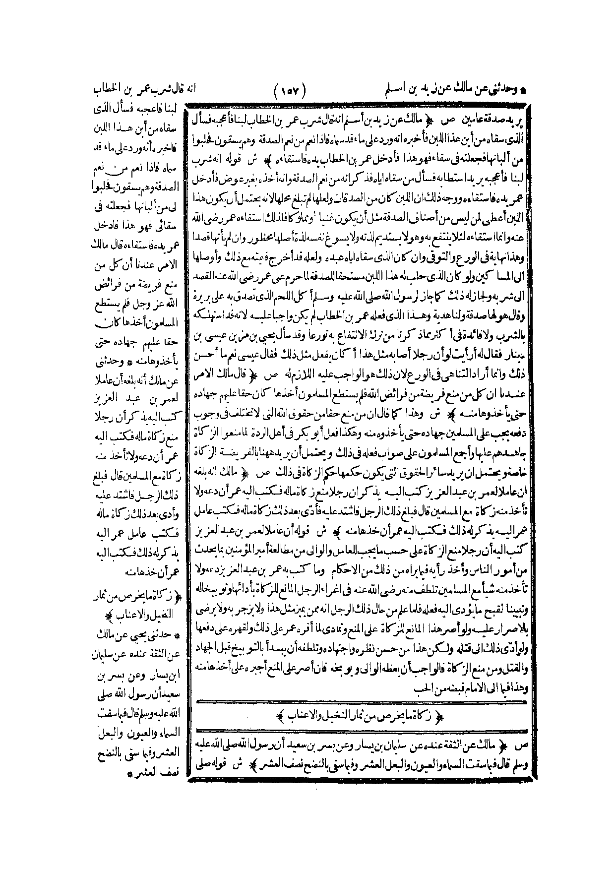 (ص) : (مَالِكٌ عَنْ زَيْدِ بْنِ أَسْلَمَ أَنَّهُ قَالَ شَرِبَ عُمَرُ بْنُ الْخَطَّابِ لَبَنًا فَأَعْجَبَهُ فَسَأَلَ الَّذِي سَقَاهُ مِنْ أَيْنَ هَذَا اللَّبَنُ؟ فَأَخْبَرَهُ أَنَّهُ وَرَدَ عَلَى مَاءٍ قَدْ سَمَّاهُ فَإِذَا نَعَمٌ مِنْ نَعَمِ الصَّدَقَةِ وَهُمْ يَسْقُونَ فَحَلَبُوا مِنْ أَلْبَانِهَا فَجَعَلْته فِي سِقَاءٍ فَهُوَ هَذَا فَأَدْخَلَ عُمَرُ بْنُ الْخَطَّابِ يَدَهُ فَاسْتَقَاءَهُ) .