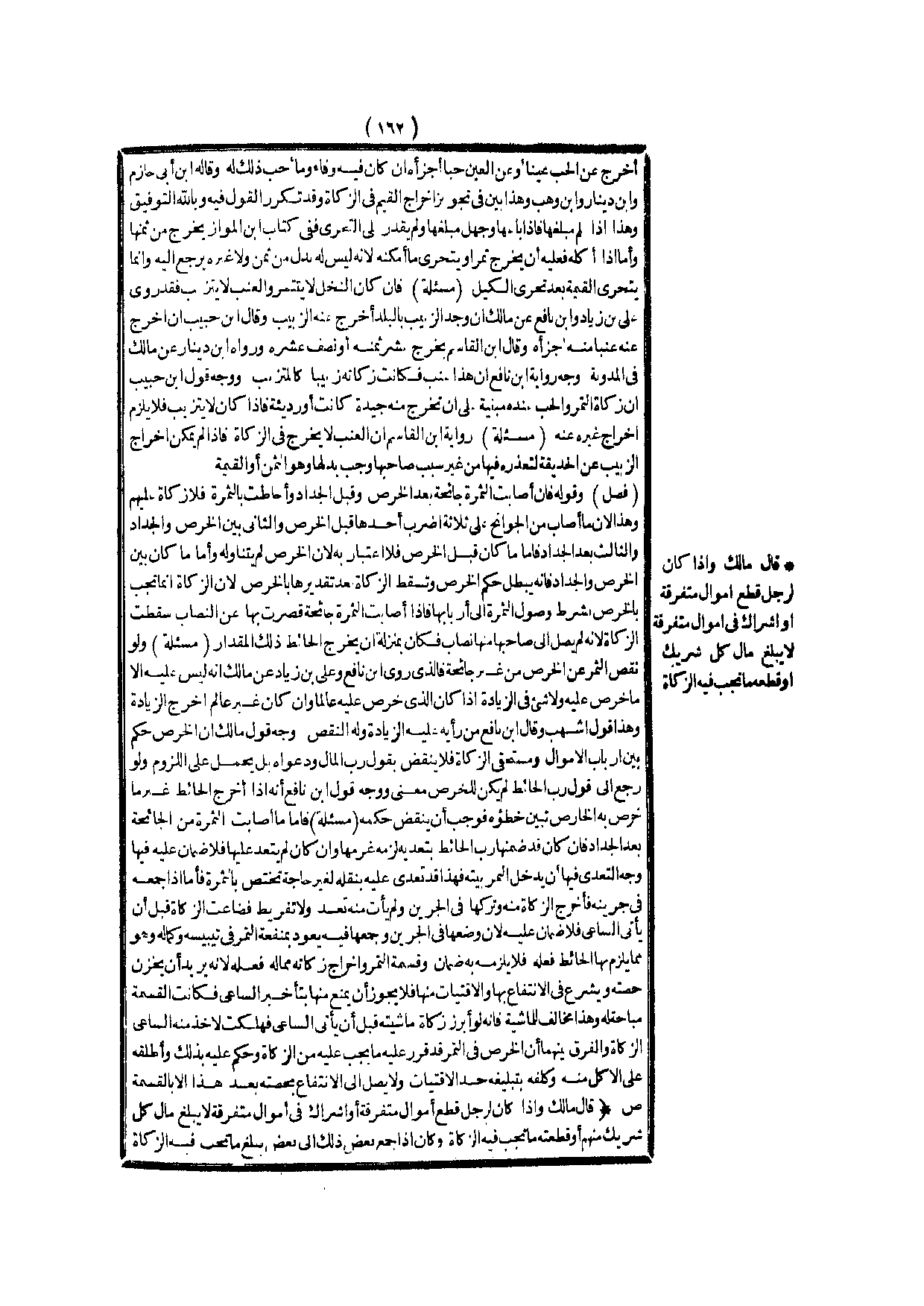 (ص) : (قَالَ مَالِكٌ: وَإِذَا كَانَ لِرَجُلٍ قِطَعُ أَمْوَالٍ مُتَفَرِّقَةٍ أَوْ إشْرَاكٌ فِي أَمْوَالٍ مُتَفَرِّقَةٍ لَا يَبْلُغُ مَالُ كُلِّ شَرِيكٍ مِنْهُمْ أَوْ قِطْعَتُهُ مَا تَجِبُ فِيهِ الزَّكَاةُ وَكَانَ إذَا جَمَعَ بَعْضَ ذَلِكَ إلَى بَعْضٍ يَبْلُغُ مَا تَجِبُ فِيهِ الزَّكَاةُ