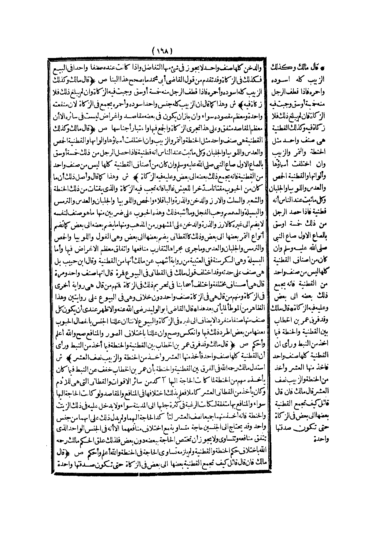(ش) : اسْتَدَلَّ مَالِكٌ - رَحِمَهُ اللَّهُ - فِي الْفَرْقِ بَيْنَ الْقُطْنِيَّةِ وَالْحِنْطَةِ بِأَنَّ عُمَرَ بْنَ الْخَطَّابِ خَفَّفَ عَنْ النَّبَطِ فِيمَا كَانَ يَأْخُذُهُ مِنْهُمْ مِنْ الْحِنْطَةِ لَمَّا كَانَتْ الْحَاجَةُ إلَيْهَا آكَدَ مِنْ سَائِرِ الْأَقْوَاتِ وَالْقَطَانِيِّ الَّتِي هِيَ لِلْأُدْمِ وَكَانَ يَأْخُذُ مِنْ الْقَطَانِيِّ الْعُشْرَ كَامِلًا فَعُلِمَ بِذَلِكَ اخْتِلَافُهَا فِي الْمَنَافِعِ وَالْمَقَاصِدِ وَلَوْ كَانَتْ الْحَاجَةُ إلَيْهَا سَوَاءً وَالْمَنَافِعُ بِهَا مُتَّفِقَةً لَكَانَتْ الرَّغْبَةُ فِي كَثْرَةِ جَلْبِهَا إلَى الْمَدِينَةِ سَوَاءً، وَلَا يُدْخَلُ عَلَيْهِ فِي ذَلِكَ الزَّيْتُ وَالْحِنْطَةُ فَإِنَّهُ أَخَذَ مِنْهُمَا جَمِيعًا نِصْفَ الْعُشْرِ لِتَأَكُّدِ الْحَاجَةِ إلَيْهِمَا وَلَمْ يَدُلَّ ذَلِكَ عَلَى أَنَّهُمَا مِنْ جِنْسٍ وَاحِدٍ وَقَدْ يَحْتَاجُ إلَى الْجِنْسَيْنِ حَاجَةً مُتَسَاوِيَةً مَعَ اخْتِلَافِ مَنَافِعِهِمَا إلَّا أَنَّهُ فِي الْجِنْسِ الْوَاحِدِ الَّذِي تَتَّفِقُ مَنَافِعُهُ وَتَتَسَاوَى وَلَا يَجُوزُ أَنْ تَخْتَصَّ الْحَاجَةُ بِبَعْضِهِ دُونَ بَعْضٍ فَلِذَلِكَ عَلَّقَ الْحُكْمَ مَالِكٌ - رَحِمَهُ اللَّهُ - بِاخْتِلَافِ حُكْمِ الْحِنْطَةِ وَالْقُطْنِيَّةِ وَلَمْ يَلْزَمْهُ تَسَاوِي الْحَاجَةِ فِي الْحِنْطَةِ - وَاَللَّهُ أَعْلَمُ وَأَحْكَمُ -.