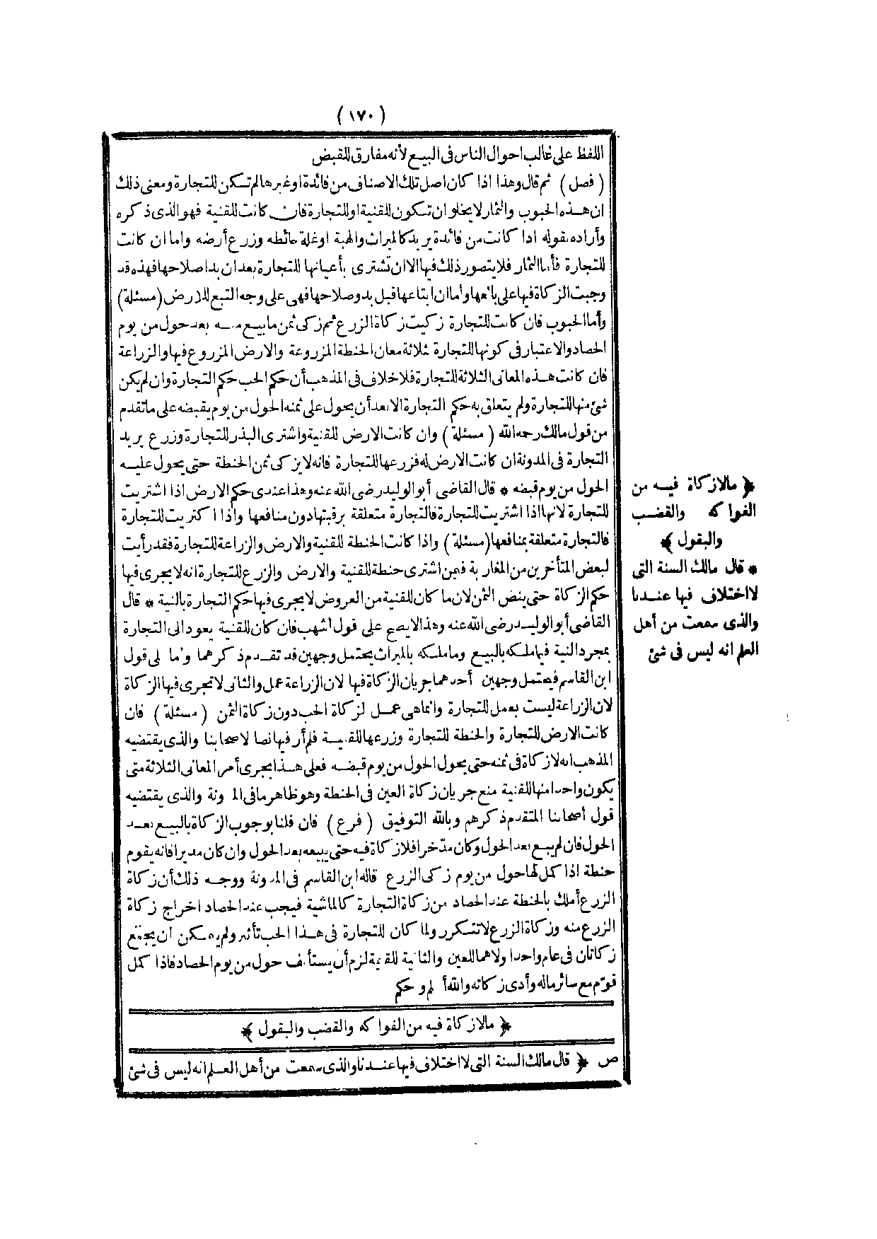 وَأَمَّا الْحُبُوبُ فَإِنْ كَانَتْ لِلتِّجَارَةِ زُكِّيَتْ زَكَاةَ الزَّرْعِ، ثُمَّ زُكِّيَ ثَمَنُ مَا بِيعَ مِنْهُ بَعْدَ حَوْلٍ مِنْ يَوْمِ الْحَصَادِ، وَالِاعْتِبَارُ فِي كَوْنِهَا لِلتِّجَارَةِ بِثَلَاثَةِ مَعَانٍ: الْحِنْطَةُ الْمَزْرُوعَةُ، وَالْأَرْضُ الْمَزْرُوعُ فِيهَا وَالزِّرَاعَةُ فَإِنْ كَانَتْ هَذِهِ الْمَعَانِي الثَّلَاثَةُ لِلتِّجَارَةِ فَلَا خِلَافَ فِي الْمَذْهَبِ أَنَّ حُكْمَ الْحَبِّ حُكْمُ التِّجَارَةِ وَإِنْ لَمْ يَكُنْ شَيْءٌ مِنْهَا لِلتِّجَارَةِ، وَلَمْ يَتَعَلَّقْ بِهِ حُكْمُ التِّجَارَةِ إلَّا بَعْدَ أَنْ يَحُولَ عَلَى ثَمَنِهِ الْحَوْلُ مِنْ يَوْمِ يَقْبِضَهُ عَلَى مَا تَقَدَّمَ مِنْ قَوْلِ مَالِكٍ - رَحِمَهُ اللَّهُ -.