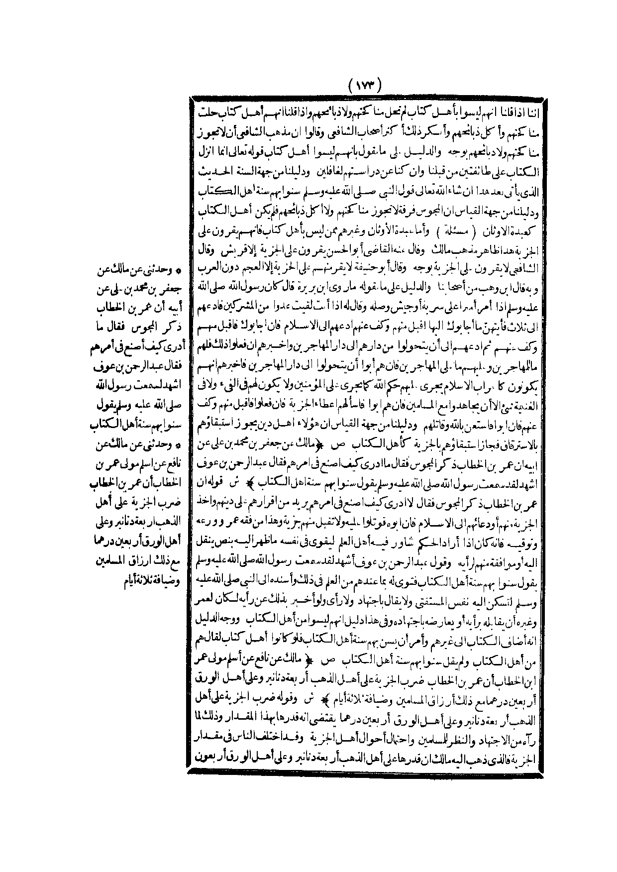 (ص) : (مَالِكٌ عَنْ جَعْفَرِ بْنِ مُحَمَّدِ بْنِ عَلِيٍّ عَنْ أَبِيهِ أَنَّ عُمَرَ بْنَ الْخَطَّابِ ذَكَرَ الْمَجُوسَ فَقَالَ مَا أَدْرِي كَيْفَ أَصْنَعُ فِي أَمْرِهِمْ؟ فَقَالَ عَبْدُ الرَّحْمَنِ بْنُ عَوْفٍ: أَشْهَدُ لَقَدْ سَمِعْت رَسُولَ اللَّهِ - صَلَّى اللَّهُ عَلَيْهِ وَسَلَّمَ - يَقُولُ «سُنُّوا بِهِمْ سُنَّةَ أَهْلِ الْكِتَابِ» ) .