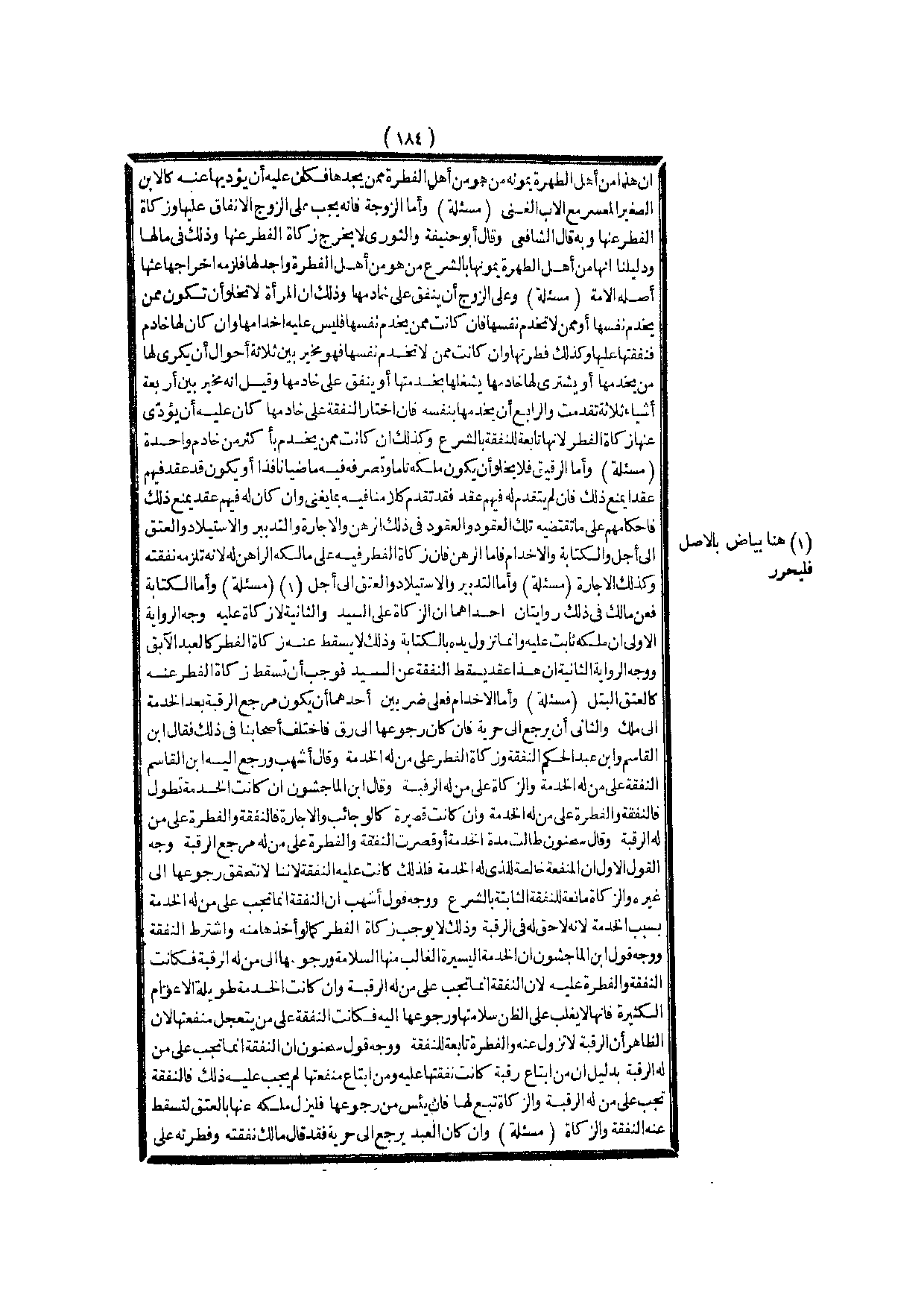 وَالثَّانِي: أَنْ يَرْجِعَ إلَى حُرِّيَّةٍ فَإِنْ كَانَ رُجُوعُهَا إلَى رِقٍّ فَاخْتَلَفَ أَصْحَابُنَا فِي ذَلِكَ فَقَالَ ابْنُ الْقَاسِمِ وَابْنُ عَبْدِ الْحَكَمِ: النَّفَقَةُ وَزَكَاةُ الْفِطْرِ عَلَى مَنْ لَهُ الْخِدْمَةُ.