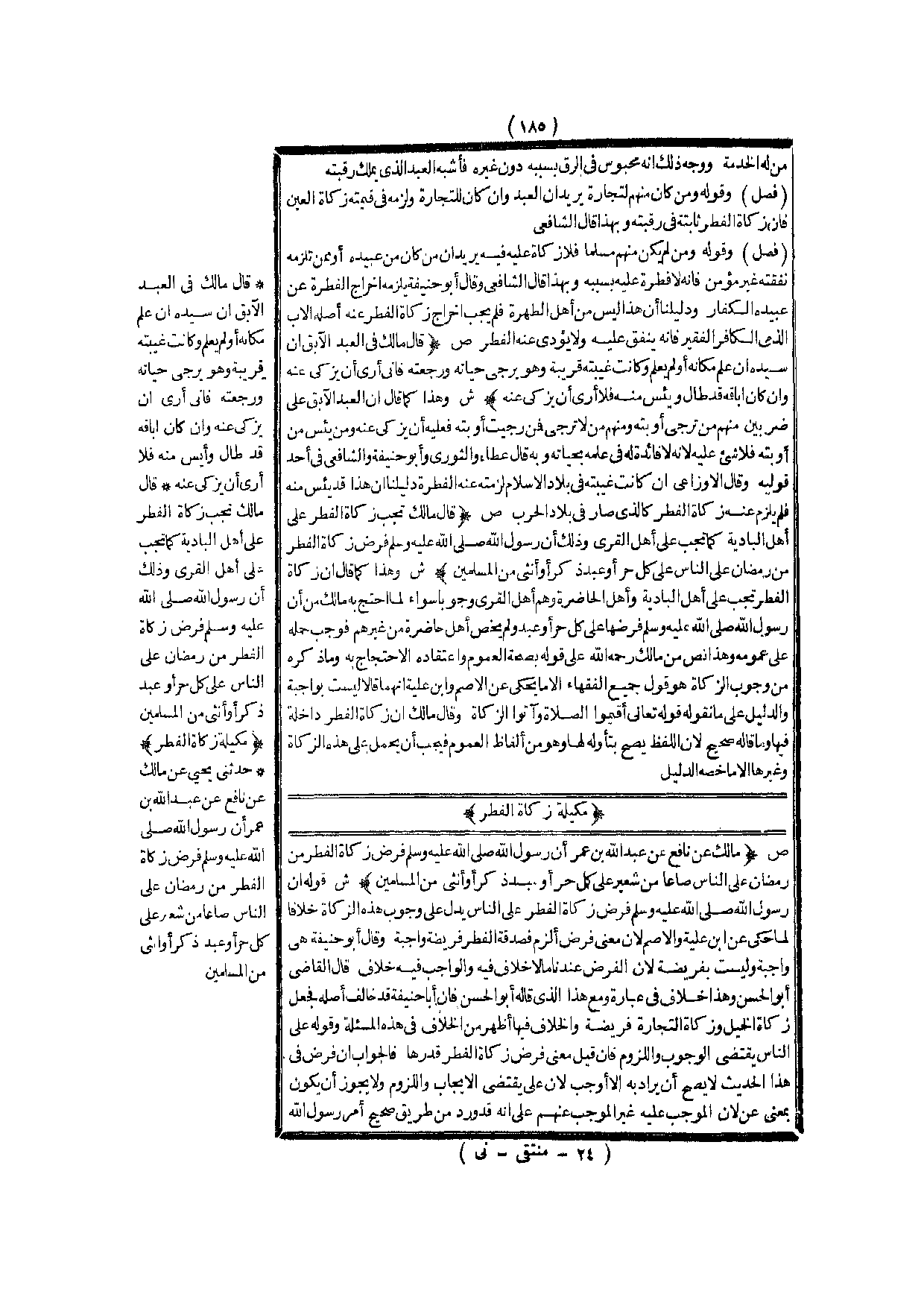 (ص) : (قَالَ مَالِكٌ تَجِبُ زَكَاةُ الْفِطْرِ عَلَى أَهْلِ الْبَادِيَةِ كَمَا تَجِبُ عَلَى أَهْلِ الْقُرَى وَذَلِكَ «أَنَّ رَسُولَ اللَّهِ - صَلَّى اللَّهُ عَلَيْهِ وَسَلَّمَ - فَرَضَ زَكَاةَ الْفِطْرِ مِنْ رَمَضَانَ عَلَى النَّاسِ عَلَى كُلِّ حُرٍّ أَوْ عَبْدٍ ذَكَرٍ أَوْ أُنْثَى مِنْ الْمُسْلِمِينَ» ) .