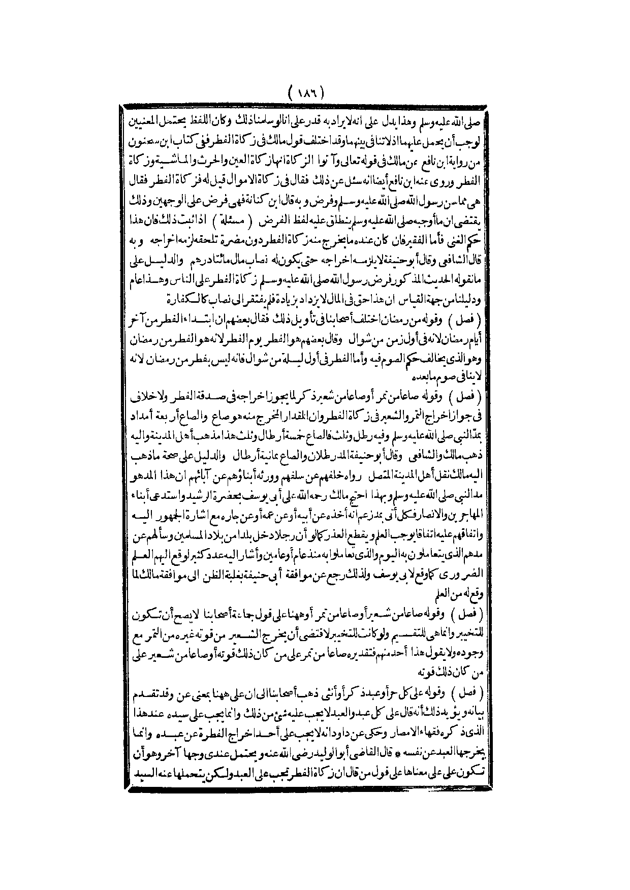 (فَصْلٌ) وَقَوْلُهُ صَاعًا مِنْ تَمْرٍ أَوْ صَاعًا مِنْ شَعِيرٍ ذِكْرٌ لِمَا يَجُوزُ إخْرَاجُهُ فِي صَدَقَةِ الْفِطْرِ وَلَا خِلَافَ فِي جَوَازِ إخْرَاجِ التَّمْرِ وَالشَّعِيرِ فِي زَكَاةِ الْفِطْرِ، وَأَنَّ الْمِقْدَارَ الْمُخْرَجَ مِنْهُ هُوَ صَاعٌ، وَالصَّاعُ أَرْبَعَةُ أَمْدَادٍ بِمُدِّ النَّبِيِّ - صَلَّى اللَّهُ عَلَيْهِ وَسَلَّمَ - وَفِيهِ رِطْلٌ وَثُلُثٌ فَالصَّاعُ خَمْسَةُ أَرْطَالٍ وَثُلُثٌ هَذَا مَذْهَبُ أَهْلِ الْمَدِينَةِ وَإِلَيْهِ ذَهَبَ مَالِكٌ وَالشَّافِعِيُّ.
