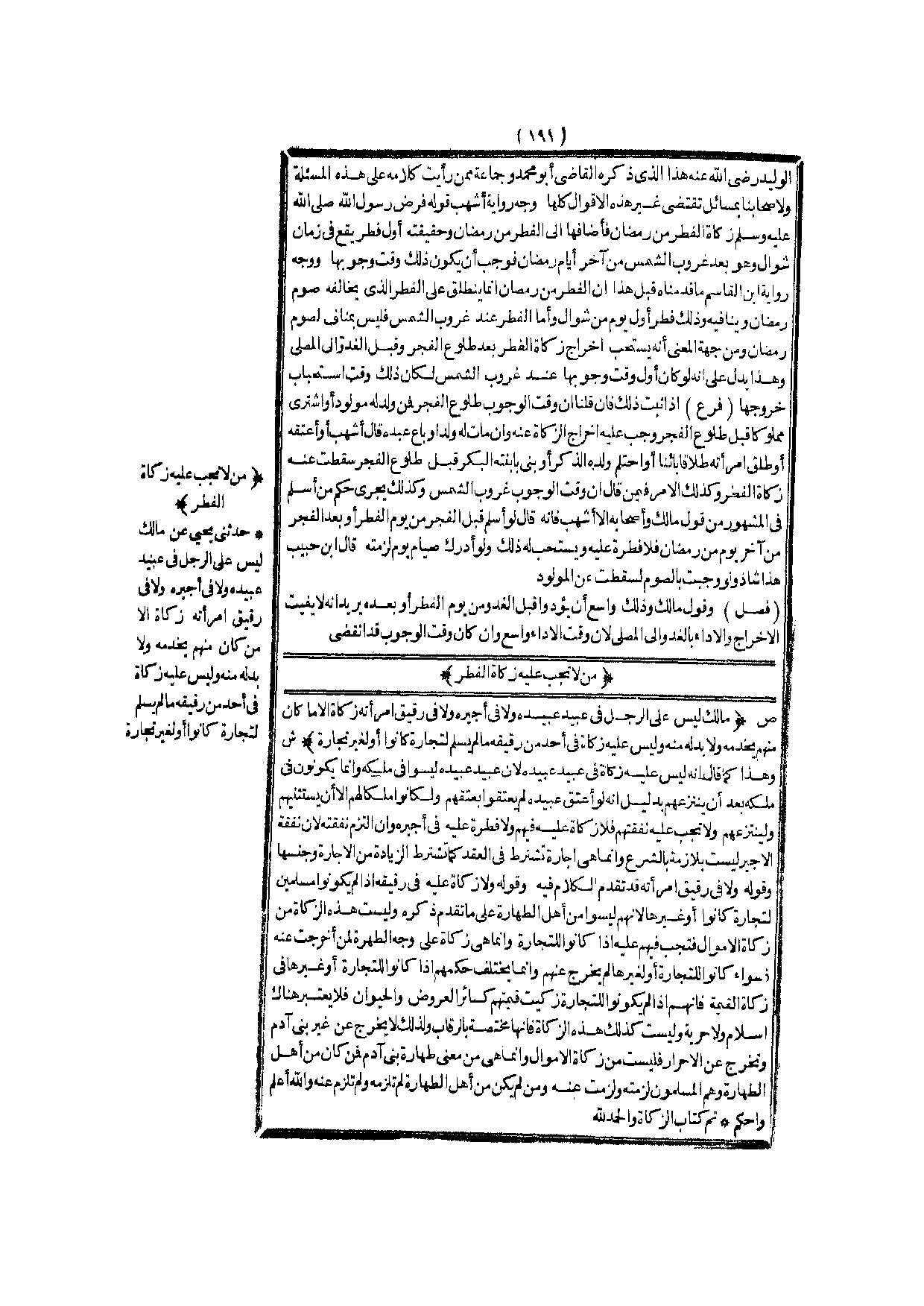 وَقَوْلُهُ وَلَا فِي رَقِيقِ امْرَأَتِهِ قَدْ تَقَدَّمَ الْكَلَامُ فِيهِ وَقَوْلُهُ وَلَا زَكَاةَ عَلَيْهِ فِي رَقِيقِهِ إذَا لَمْ يَكُونُوا مُسْلِمِينَ لِتِجَارَةٍ كَانُوا أَوْ غَيْرِهَا؛ لِأَنَّهُمْ لَيْسُوا مِنْ أَهْلِ الطَّهَارَةِ عَلَى مَا تَقَدَّمَ ذِكْرُهُ وَلَيْسَتْ هَذِهِ الزَّكَاةُ مِنْ زَكَاةِ الْأَمْوَالِ فَتَجِبُ فِيهِمْ عَلَيْهِ إذَا كَانُوا لِلتِّجَارَةِ، وَإِنَّمَا هِيَ زَكَاةٌ عَلَى وَجْهِ الطُّهْرَةِ لِمَنْ أُخْرِجَتْ عَنْهُ فَسَوَاءٌ كَانُوا لِلتِّجَارَةِ أَوْ لِغَيْرِهَا لَمْ يُخْرِجْ عَنْهُمْ وَإِنَّمَا يَخْتَلِفُ حُكْمُهُمْ إذَا كَانُوا لِلتِّجَارَةِ أَوْ غَيْرِهَا فِي زَكَاةِ الْقِيمَةِ، فَإِنَّهُمْ إذَا لَمْ يَكُونُوا لِلتِّجَارَةِ زُكِّيَتْ قِيمَتُهُمْ كَسَائِرِ الْعُرُوضِ وَالْحَيَوَانِ فَلَا يُعْتَبَرُ هُنَاكَ إسْلَامٌ وَلَا حُرِّيَّةٌ وَلَيْسَتْ كَذَلِكَ هَذِهِ الزَّكَاةُ فَإِنَّهَا مُخْتَصَّةٌ بِالرِّقَابِ؛ وَلِذَلِكَ لَا يُخْرَجُ عَنْ غَيْرِ بَنَى آدَمَ وَتُخْرَجُ عَنْ الْأَحْرَارِ فَلَيْسَتْ مِنْ زَكَاةِ الْأَمْوَالِ وَإِنَّمَا هِيَ مِنْ مَعْنَى طَهَارَةِ بَنِي آدَمَ فَمَنْ كَانَ مِنْ أَهْلِ الطَّهَارَةِ وَهُمْ الْمُسْلِمُونَ لَزِمَتْهُ وَلَزِمَتْ عَنْهُ، وَمَنْ لَمْ يَكُنْ مِنْ أَهْلِ الطَّهَارَةِ لَمْ تَلْزَمْ عَنْهُ وَاَللَّهُ أَعْلَمُ وَأَحْكَمُ تَمَّ كِتَابُ الزَّكَاةِ وَالْحَمْدُ لِلَّهِ.