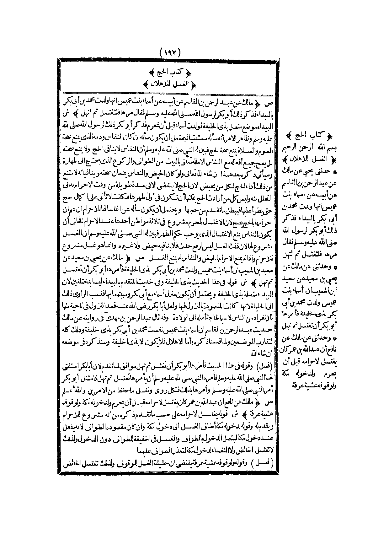 كِتَابُ الْحَجِّ الْغُسْلُ لِلْإِهْلَالِ (ص) : (مَالِكٌ عَنْ عَبْدِ الرَّحْمَنِ بْنِ الْقَاسِمِ عَنْ أَبِيهِ «عَنْ أَسْمَاءَ بِنْتِ عُمَيْسٍ أَنَّهَا وَلَدَتْ مُحَمَّدَ بْنَ أَبِي بَكْرٍ بِالْبَيْدَاءِ فَذَكَرَ ذَلِكَ أَبُو بَكْرٍ لِرَسُولِ اللَّهِ - صَلَّى اللَّهُ عَلَيْهِ وَسَلَّمَ - فَقَالَ مُرْهَا فَلْتَغْتَسِلْ، ثُمَّ لِتُهِلَّ» ) .