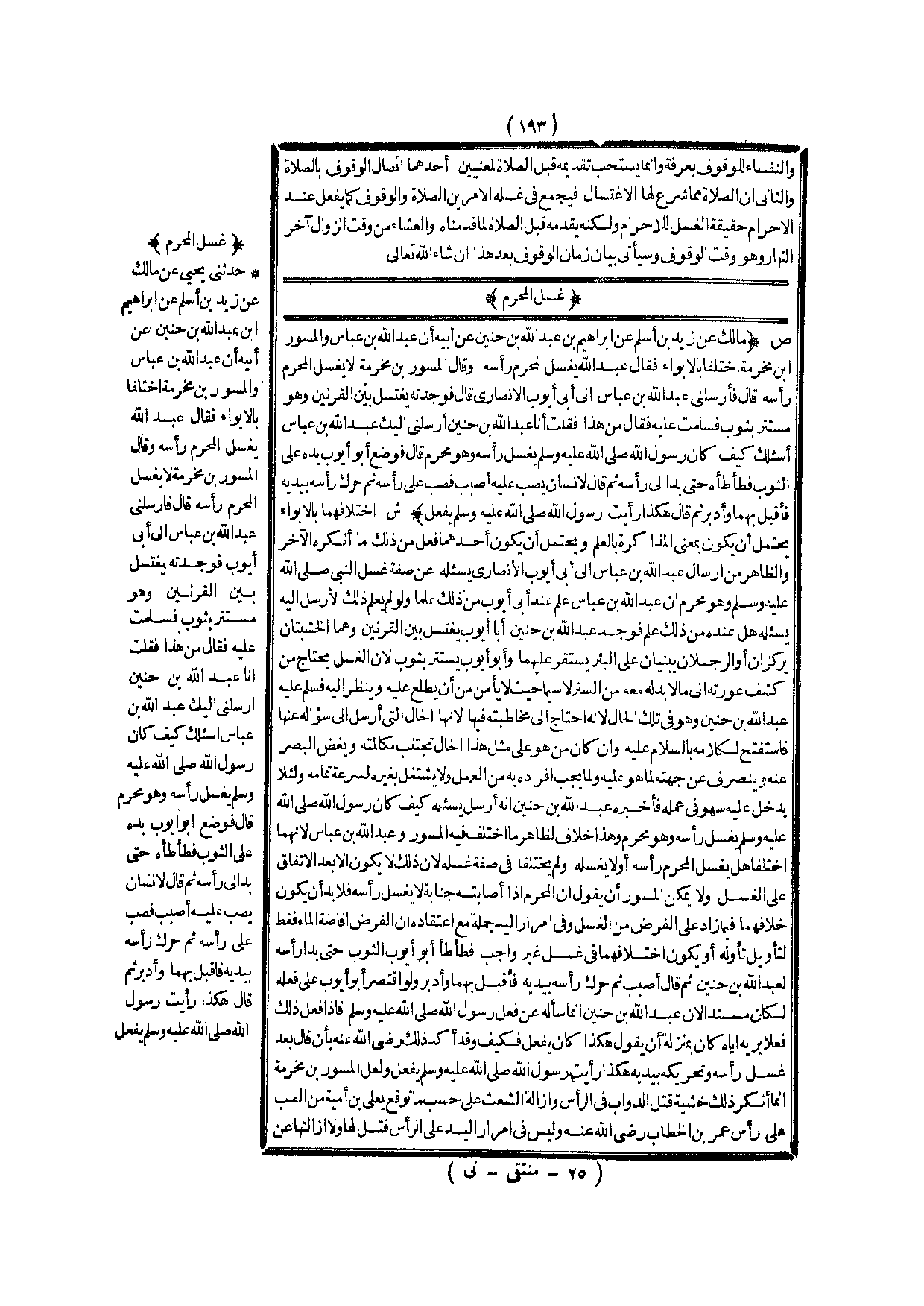 غُسْلُ الْمُحْرِمِ (ص) : (مَالِكٌ عَنْ زَيْدِ بْنِ أَسْلَمَ عَنْ إبْرَاهِيمَ بْنِ عَبْدِ اللَّهِ بْنِ حُنَيْنٍ عَنْ أَبِيهِ أَنَّ عَبْدَ اللَّهِ بْنَ عَبَّاسٍ وَالْمِسْوَرَ بْنَ مَخْرَمَةَ اخْتَلَفَا بِالْأَبْوَاءِ فَقَالَ عَبْدُ اللَّهِ: يَغْسِلُ الْمُحْرِمُ رَأْسَهُ وَقَالَ الْمِسْوَرُ بْنُ مَخْرَمَةَ لَا يَغْسِلُ الْمُحْرِمُ رَأْسَهُ قَالَ فَأَرْسَلَنِي عَبْدُ اللَّهِ بْنُ عَبَّاسٍ إلَى أَبِي أَيُّوبَ الْأَنْصَارِيِّ قَالَ فَوَجَدْتُهُ يَغْتَسِلُ بَيْنَ الْقَرْنَيْنِ وَهُوَ مُسْتَتِرٌ بِثَوْبٍ فَسَلَّمْت عَلَيْهِ فَقَالَ مَنْ هَذَا فَقُلْت أَنَا عَبْدُ اللَّهِ بْنُ حُنَيْنٍ أَرْسَلَنِي إلَيْك عَبْدُ اللَّهِ بْنُ عَبَّاسٍ أَسْأَلُك كَيْفَ كَانَ رَسُولُ اللَّهِ - صَلَّى اللَّهُ عَلَيْهِ وَسَلَّمَ - يَغْسِلُ رَأْسَهُ وَهُوَ مُحْرِمٌ قَالَ فَوَضَعَ أَبُو أَيُّوبَ يَدَهُ عَلَى الثَّوْبِ فَطَأْطَأَهُ حَتَّى بَدَا لِي رَأْسُهُ، ثُمَّ قَالَ لِإِنْسَانٍ يَصُبُّ عَلَيْهِ اُصْبُبْ فَصَبَّ عَلَى رَأْسِهِ، ثُمَّ حَرَّكَ رَأْسَهُ بِيَدَيْهِ فَأَقْبَلَ بِهِمَا وَأَدْبَرَ، ثُمَّ قَالَ: هَكَذَا رَأَيْت رَسُولَ اللَّهِ - صَلَّى اللَّهُ عَلَيْهِ وَسَلَّمَ - يَفْعَلُ)
