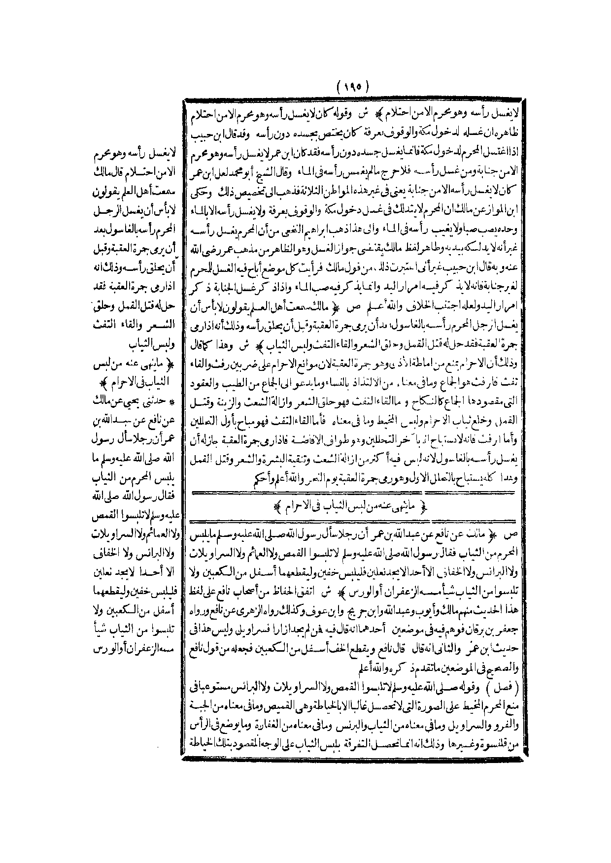 مَا يُنْهَى عَنْهُ مِنْ لُبْسِ الثِّيَابِ فِي الْإِحْرَامِ (ص) : (مَالِكٌ عَنْ نَافِعٍ عَنْ عَبْدِ اللَّهِ بْنِ عُمَرَ أَنَّ «رَجُلًا سَأَلَ رَسُولَ اللَّهِ - صَلَّى اللَّهُ عَلَيْهِ وَسَلَّمَ - مَا يَلْبَسُ الْمُحْرِمُ مِنْ الثِّيَابِ؟ فَقَالَ رَسُولُ اللَّهِ - صَلَّى اللَّهُ عَلَيْهِ وَسَلَّمَ -: لَا تَلْبَسُوا الْقُمُصَ وَلَا الْعَمَائِمَ وَلَا السَّرَاوِيلَاتِ وَلَا الْبَرَانِسَ وَلَا الْخِفَافَ إلَّا أَحَدٌ لَا يَجِدُ نَعْلَيْنِ فَلْيَلْبَسْ خُفَّيْنِ وَلْيَقْطَعْهُمَا أَسْفَلَ مِنْ الْكَعْبَيْنِ وَلَا تَلْبَسُوا مِنْ الثِّيَابِ شَيْئًا مَسَّهُ الزَّعْفَرَانُ أَوْ الْوَرْسُ» )