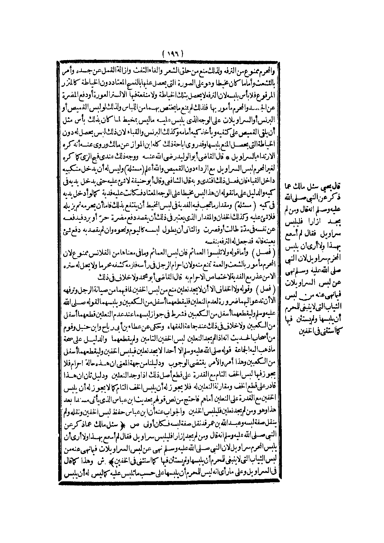 (سُئِلَ مَالِكٌ عَمَّا ذُكِرَ عَنْ النَّبِيِّ - صَلَّى اللَّهُ عَلَيْهِ وَسَلَّمَ - أَنَّهُ قَالَ «وَمَنْ لَمْ يَجِدْ إزَارًا فَلْيَلْبَسْ سَرَاوِيلَ» فَقَالَ لَمْ أَسْمَعْ بِهَذَا وَلَا أَرَى أَنْ يَلْبَسَ الْمُحْرِمُ سَرَاوِيلَ؛ لِأَنَّ النَّبِيَّ - صَلَّى اللَّهُ عَلَيْهِ وَسَلَّمَ - نَهَى عَنْ لُبْسِ السَّرَاوِيلَاتِ فِيمَا نَهَى عَنْهُ مِنْ لُبْسِ الثِّيَابِ الَّتِي لَا يَنْبَغِي لِلْمُحْرِمِ أَنْ يَلْبَسَهَا وَلَمْ يَسْتَثْنِ فِيهَا كَمَا اسْتَثْنَى فِي الْخُفَّيْنِ) ..