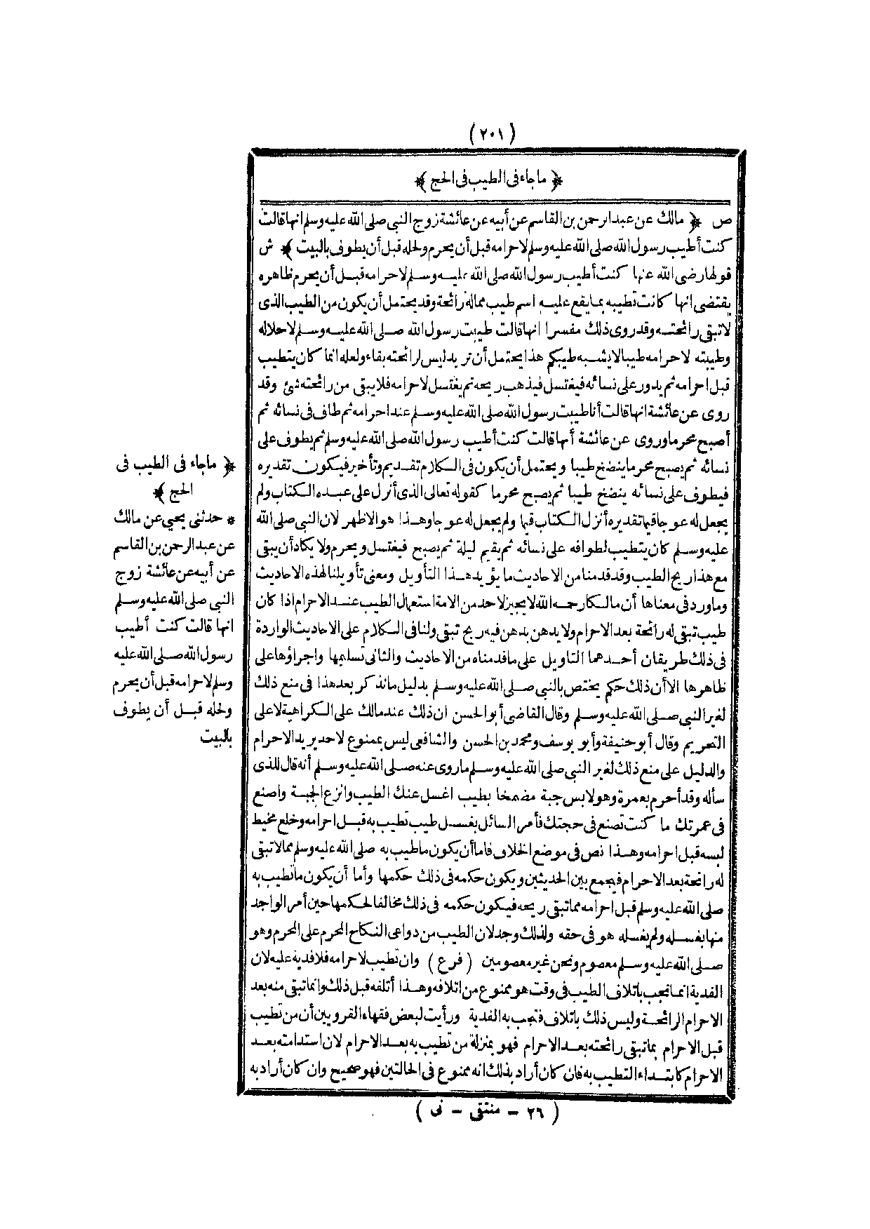 مَا جَاءَ فِي الطِّيبِ فِي الْحَجِّ (ص) : (مَالِكٌ عَنْ عَبْدِ الرَّحْمَنِ بْنِ الْقَاسِمِ عَنْ أَبِيهِ «عَنْ عَائِشَةَ زَوْجِ النَّبِيِّ - صَلَّى اللَّهُ عَلَيْهِ وَسَلَّمَ - أَنَّهَا قَالَتْ كُنْت أُطَيِّبُ رَسُولَ اللَّهِ - صَلَّى اللَّهُ عَلَيْهِ وَسَلَّمَ - لِإِحْرَامِهِ قَبْلَ أَنْ يُحْرِمَ وَلِحِلِّهِ قَبْلَ أَنْ يَطُوفَ بِالْبَيْتِ» )