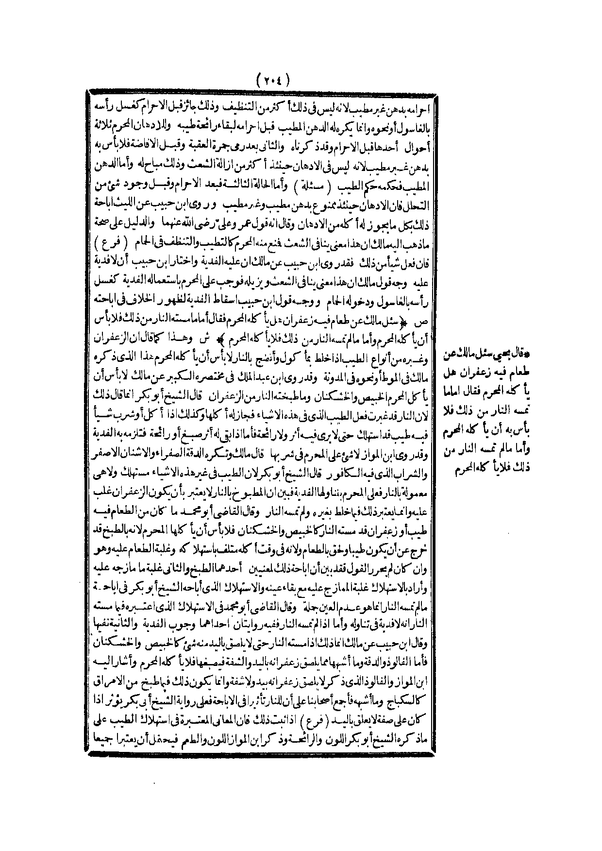(ص) : (سُئِلَ مَالِكٌ عَنْ طَعَامٍ فِيهِ زَعْفَرَانٌ هَلْ يَأْكُلُهُ الْمُحْرِمُ فَقَالَ: أَمَّا مَا مَسَّتْهُ النَّارُ مِنْ ذَلِكَ فَلَا بَأْسَ أَنْ يَأْكُلَهُ الْمُحْرِمُ وَأَمَّا مَا لَمْ تَمَسَّهُ النَّارُ مِنْ ذَلِكَ فَلَا يَأْكُلُهُ الْمُحْرِمُ) .
