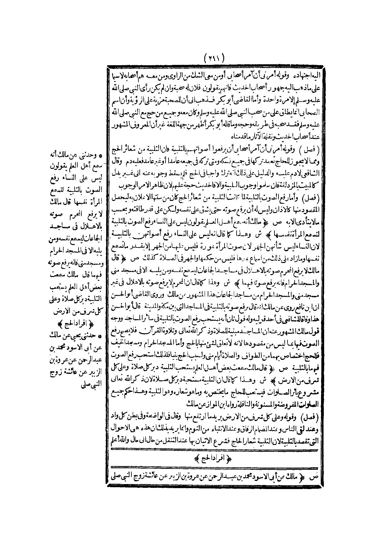 إفْرَادُ الْحَجِّ (ص) : (مَالِكٌ عَنْ أَبِي الْأَسْوَدِ مُحَمَّدِ بْنِ عَبْدِ الرَّحِيمِ عَنْ عُرْوَةَ بْنِ الزُّبَيْرِ «عَنْ عَائِشَةَ زَوْجِ النَّبِيِّ - صَلَّى اللَّهُ عَلَيْهِ وَسَلَّمَ -