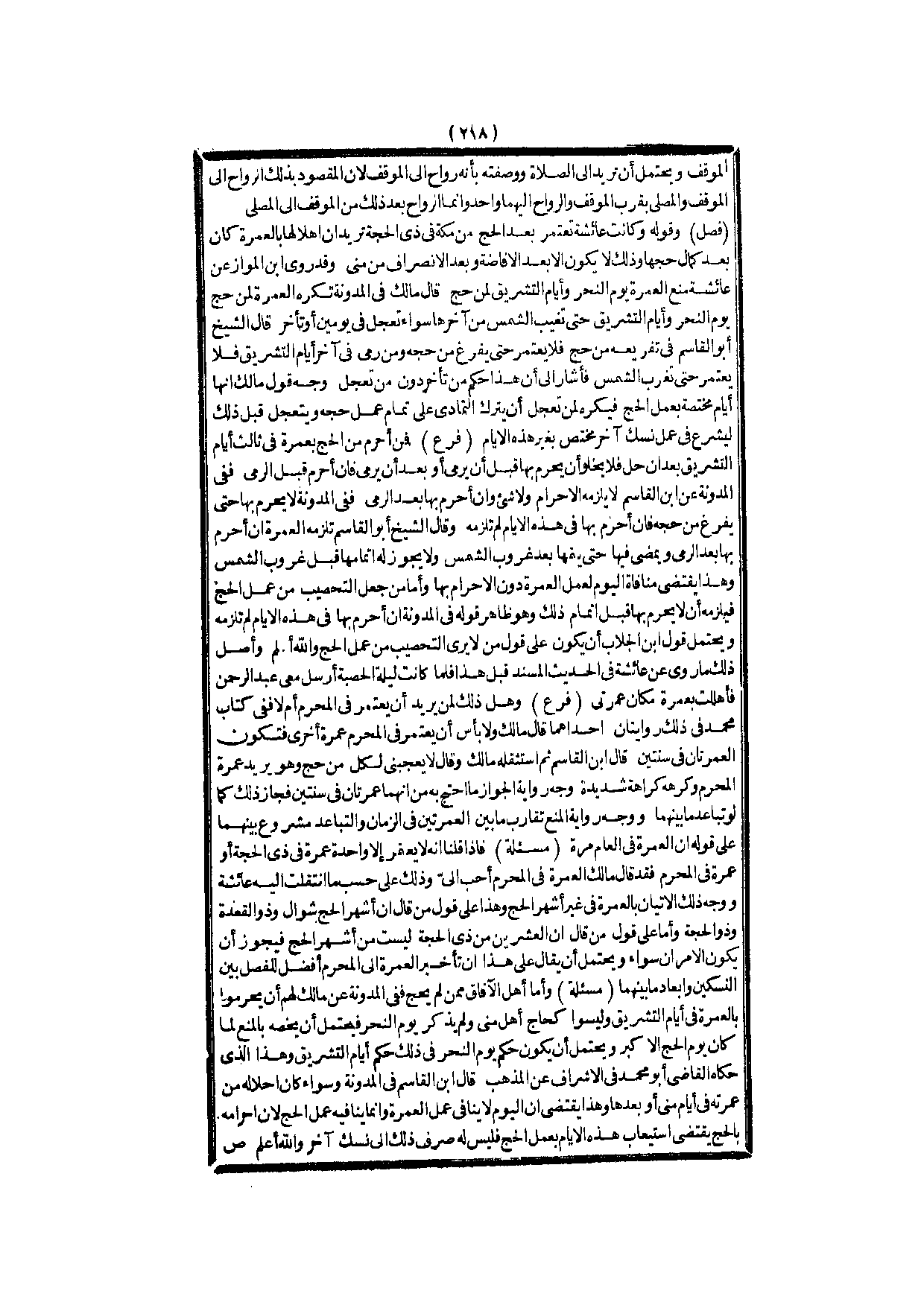 وَقَدْ رَوَى ابْنُ الْمَوَّازِ عَنْ عَائِشَةَ مَنْعَ الْعُمْرَةِ يَوْمَ النَّحْرِ وَأَيَّامَ التَّشْرِيقِ لِمَنْ حَجَّ قَالَ مَالِكٌ فِي الْمُدَوَّنَةِ تُكْرَهُ الْعُمْرَةُ لِمَنْ حَجَّ يَوْمَ النَّحْرِ وَأَيَّامَ التَّشْرِيقِ حَتَّى تَغِيبَ الشَّمْسُ مِنْ آخِرِهَا سَوَاءٌ تَعَجَّلَ فِي يَوْمَيْنِ أَوْ تَأَخَّرَ قَالَ الشَّيْخُ أَبُو الْقَاسِمِ فِي تَفْرِيعِهِ مَنْ حَجَّ فَلَا يَعْتَمِرْ حَتَّى يَفْرُغَ مِنْ حَجِّهِ وَمَنْ رَمَى فِي آخِرِ أَيَّامِ التَّشْرِيقِ فَلَا يَعْتَمِرُ حَتَّى تَغْرُبَ الشَّمْسُ فَأَشَارَ إلَى أَنَّ هَذَا حُكْمُ مَنْ تَأَخَّرَ دُونَ مَنْ تَعَجَّلَ.