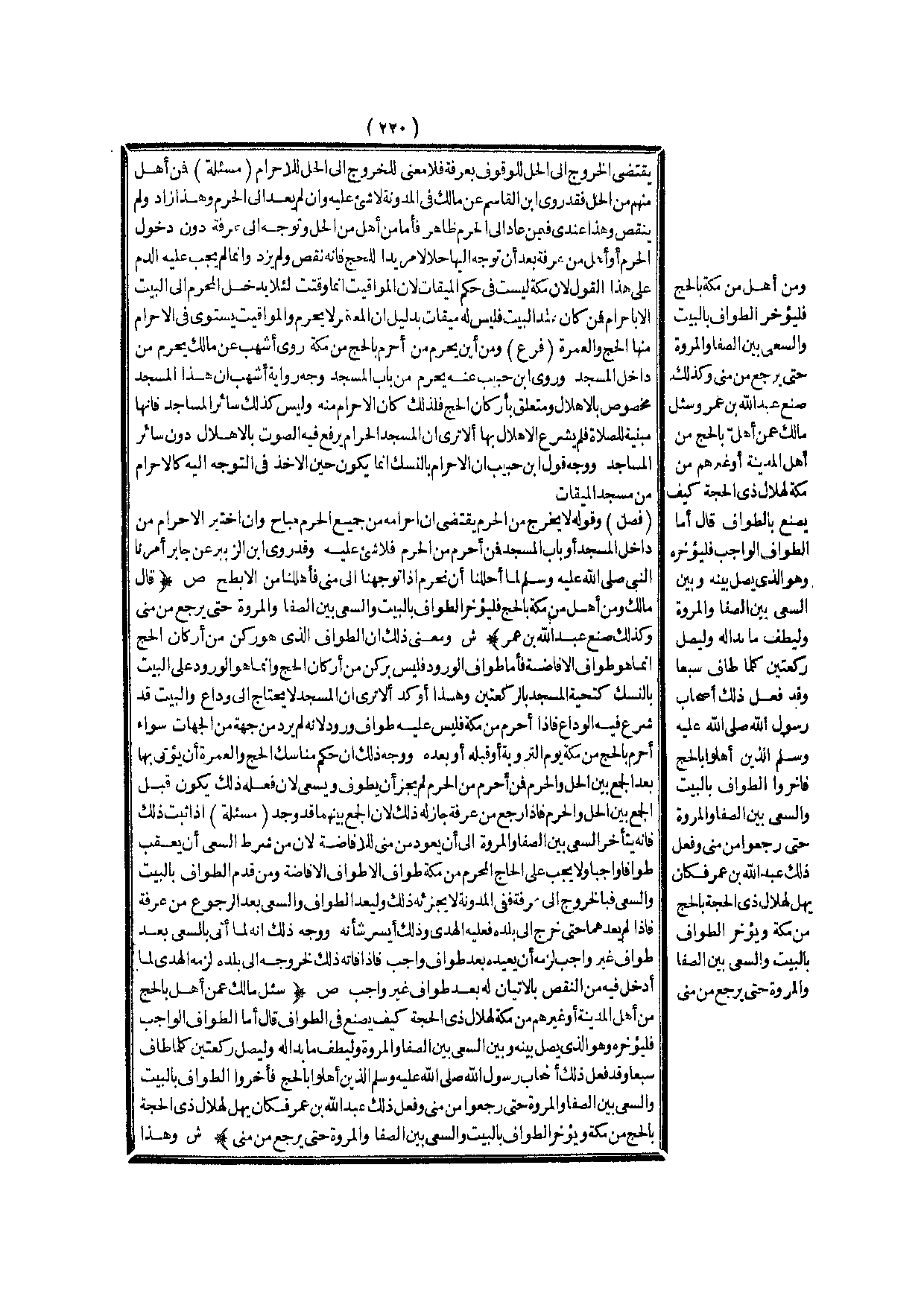 (ص) : (سُئِلَ مَالِكٌ عَمَّنْ أَهَلَّ بِالْحَجِّ مِنْ أَهْلِ الْمَدِينَةِ أَوْ غَيْرِهِمْ مِنْ مَكَّةَ لِهِلَالِ ذِي الْحِجَّةِ كَيْفَ يَصْنَعُ فِي الطَّوَافِ؟ قَالَ أَمَّا الطَّوَافُ الْوَاجِبُ فَلْيُؤَخِّرْهُ وَهُوَ الَّذِي يَصِلُ بَيْنَهُ وَبَيْنَ السَّعْيِ بَيْنَ الصَّفَا وَالْمَرْوَةِ وَلْيَطُفْ مَا بَدَا لَهُ وَلْيُصَلِّ رَكْعَتَيْنِ كُلَّمَا طَافَ سَبْعًا وَقَدْ فَعَلَ ذَلِكَ أَصْحَابُ رَسُولِ اللَّهِ - صَلَّى اللَّهُ عَلَيْهِ وَسَلَّمَ - الَّذِينَ أَهَلُّوا بِالْحَجِّ فَأَخَّرُوا الطَّوَافَ بِالْبَيْتِ وَالسَّعْيَ بَيْنَ الصَّفَا وَالْمَرْوَةِ حَتَّى رَجَعُوا مِنْ مِنًى وَفَعَلَ ذَلِكَ عَبْدُ اللَّهِ بْنُ عُمَرَ فَكَانَ يُهِلُّ لِهِلَالِ ذِي الْحِجَّةِ بِالْحَجِّ مِنْ مَكَّةَ وَيُؤَخِّرُ الطَّوَافَ بِالْبَيْتِ وَالسَّعْيَ بَيْنَ الصَّفَا وَالْمَرْوَةِ حَتَّى يَرْجِعَ مِنْ مِنًى) .