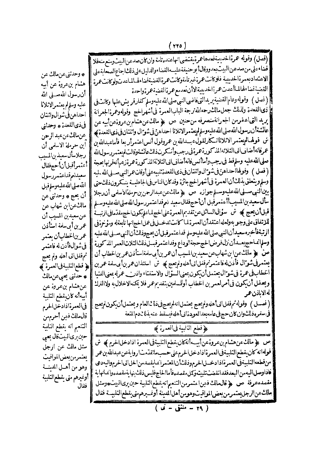 قَطْعُ التَّلْبِيَةِ فِي الْعُمْرَةِ (ص) : (مَالِكٌ عَنْ هِشَامِ بْنِ عُرْوَةَ عَنْ أَبِيهِ أَنَّهُ كَانَ يَقْطَعُ التَّلْبِيَةَ فِي الْعُمْرَةِ إذَا دَخَلَ الْحَرَمَ) .